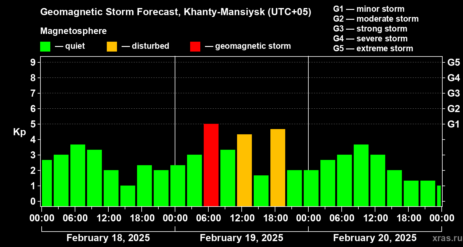 Geomagnetic activity forecast in Khanty-Mansiysk — Feb 18, 2025