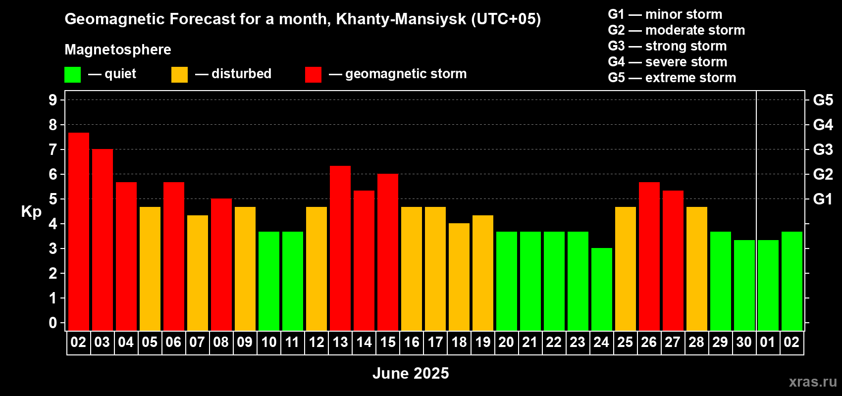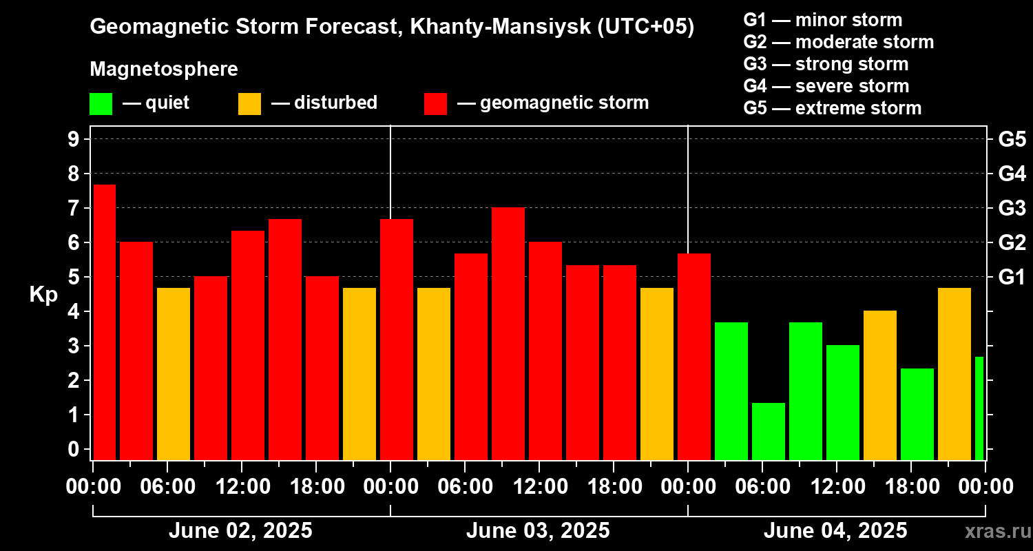 Geomagnetic storm forecast in Khanty-Mansiysk for Jun 02, 2025