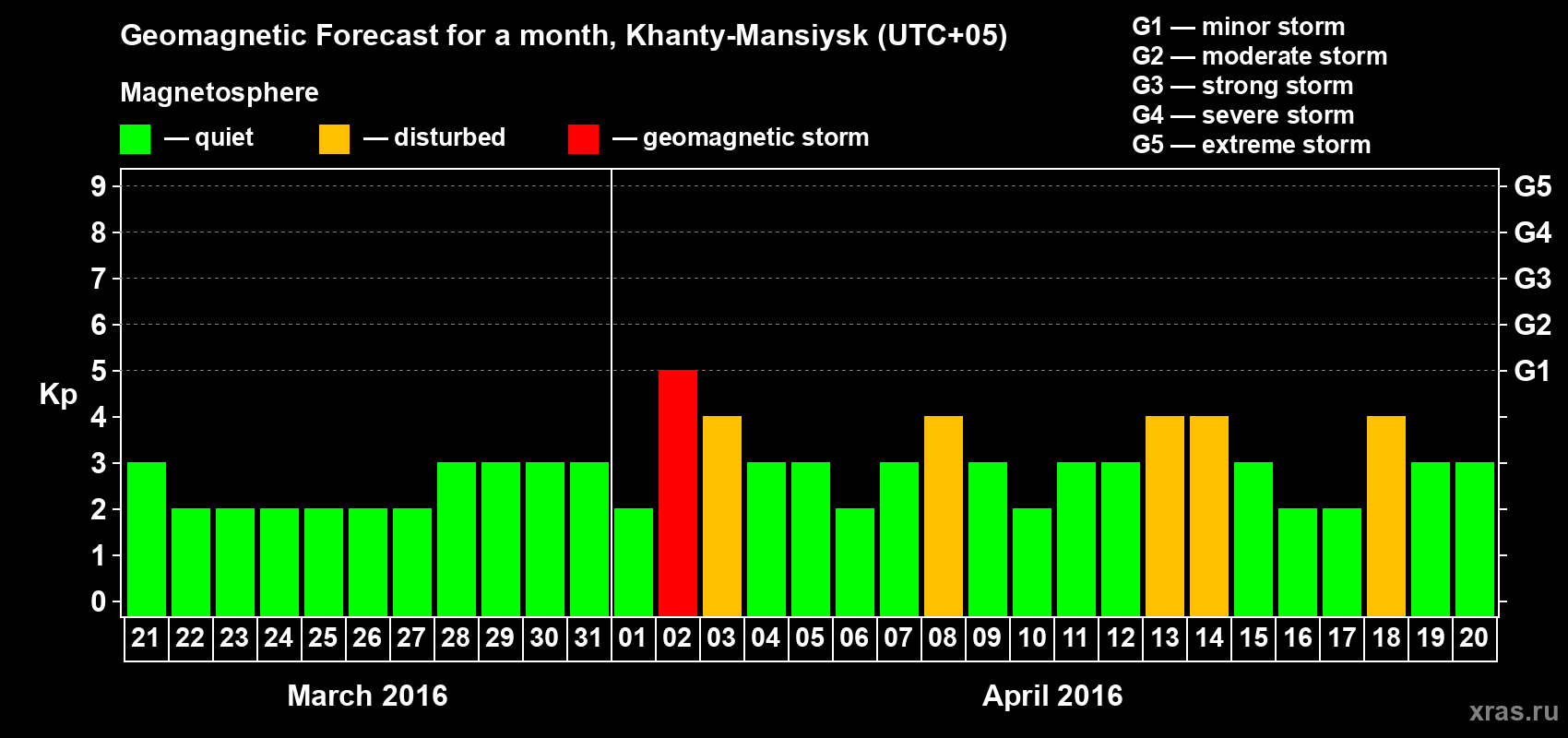 Geomagnetic activity forecast in Khanty-Mansiysk — Mar 21, 2016
