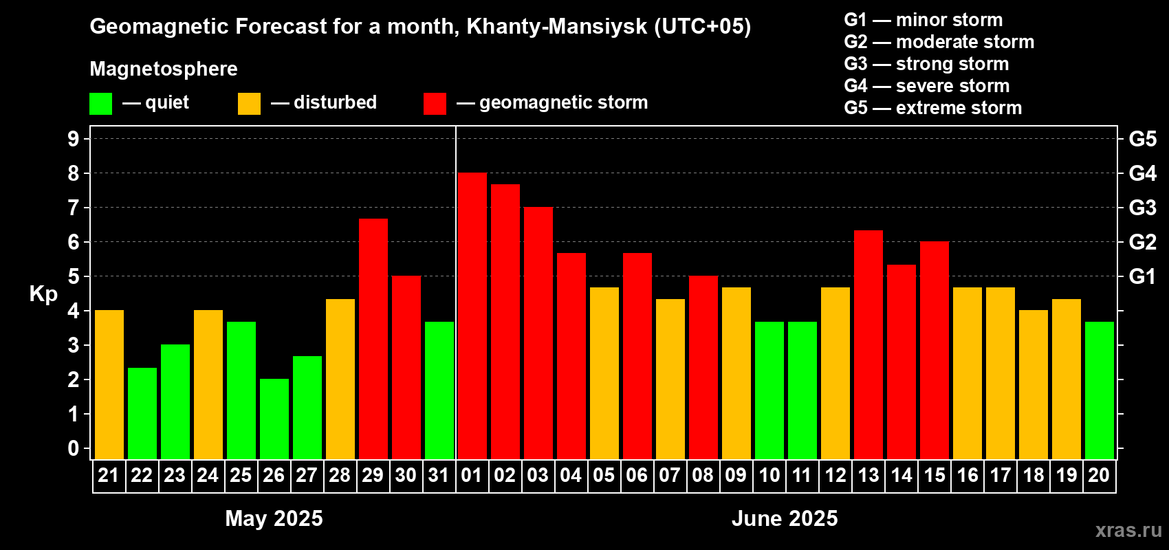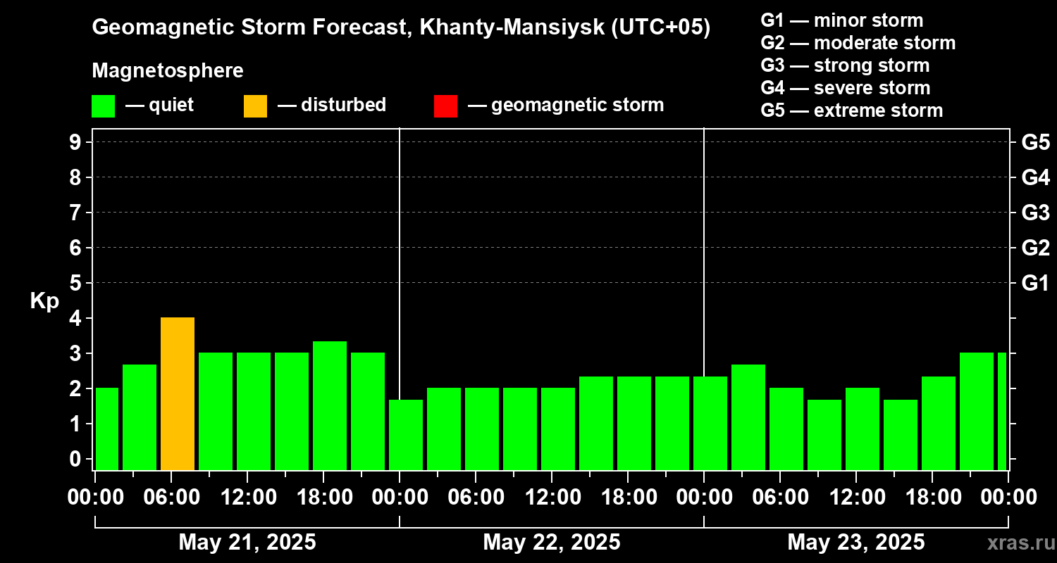 Geomagnetic storm forecast in Khanty-Mansiysk for May 21, 2025