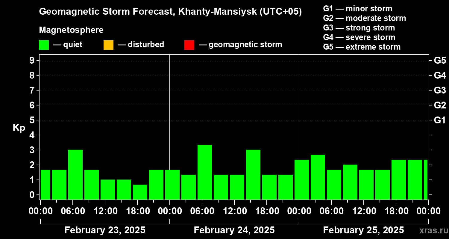 Geomagnetic activity forecast in Khanty-Mansiysk — Feb 23, 2025