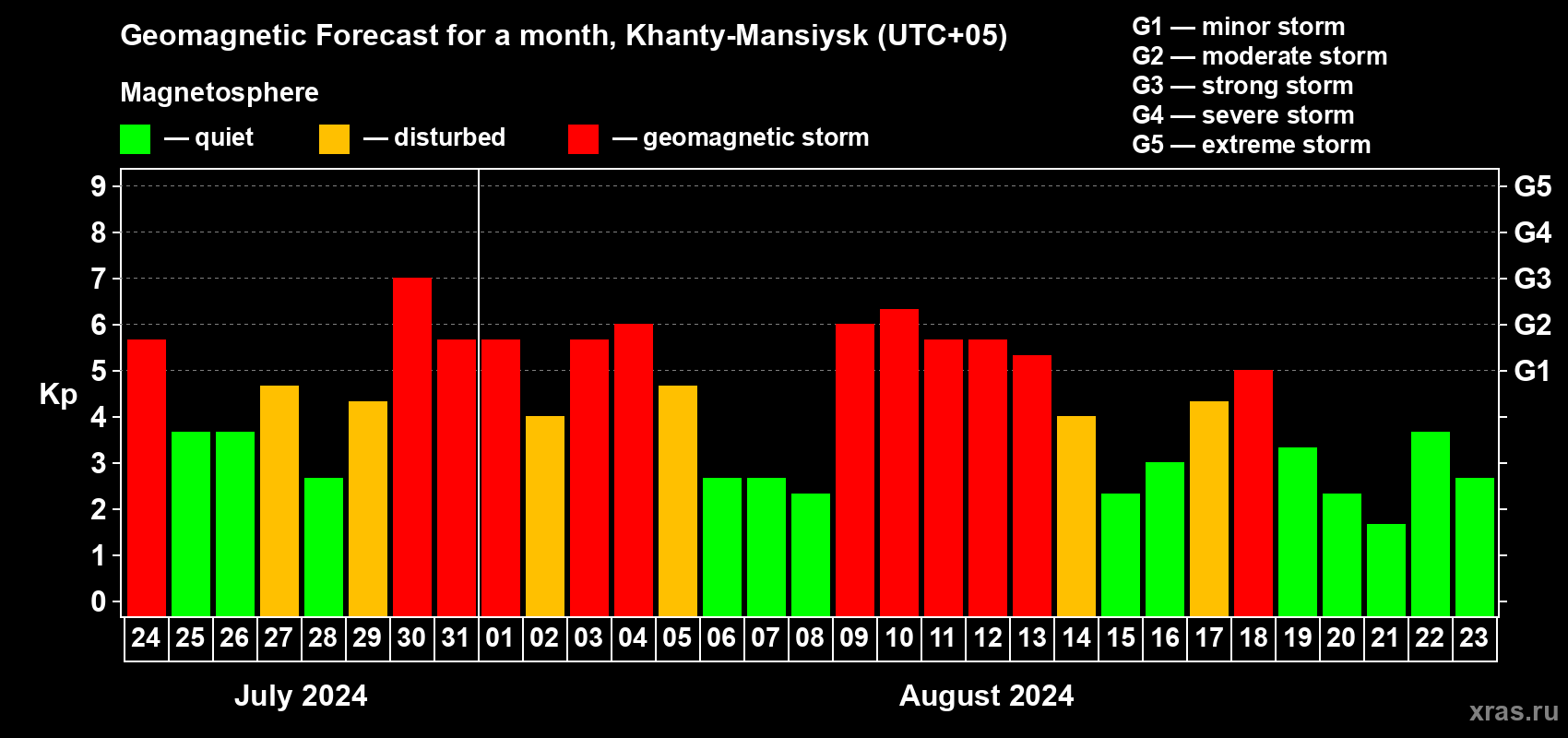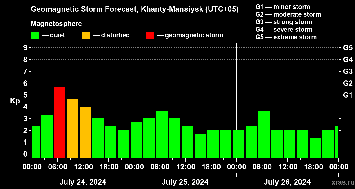 Geomagnetic storm forecast in Khanty-Mansiysk for Jul 24, 2024