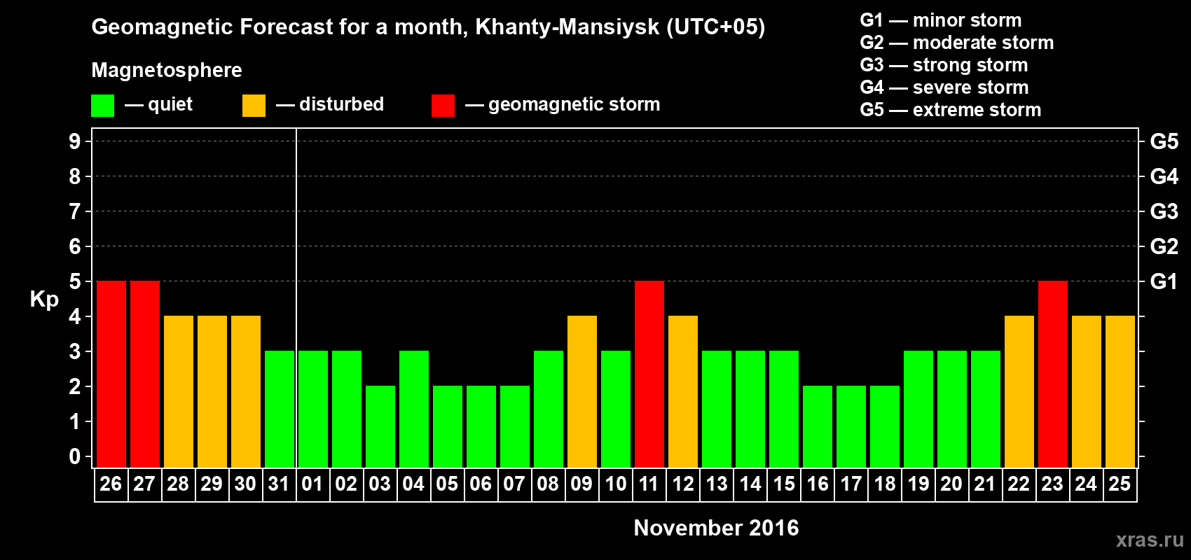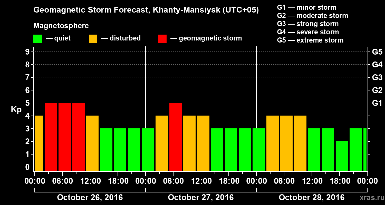Geomagnetic storm forecast in Khanty-Mansiysk for Oct 26, 2016