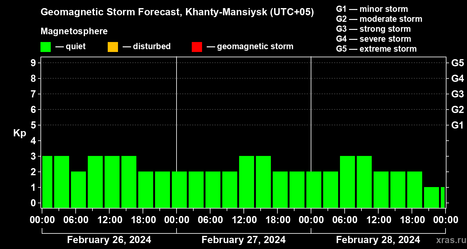 Geomagnetic storm forecast in Khanty-Mansiysk for Feb 26, 2024