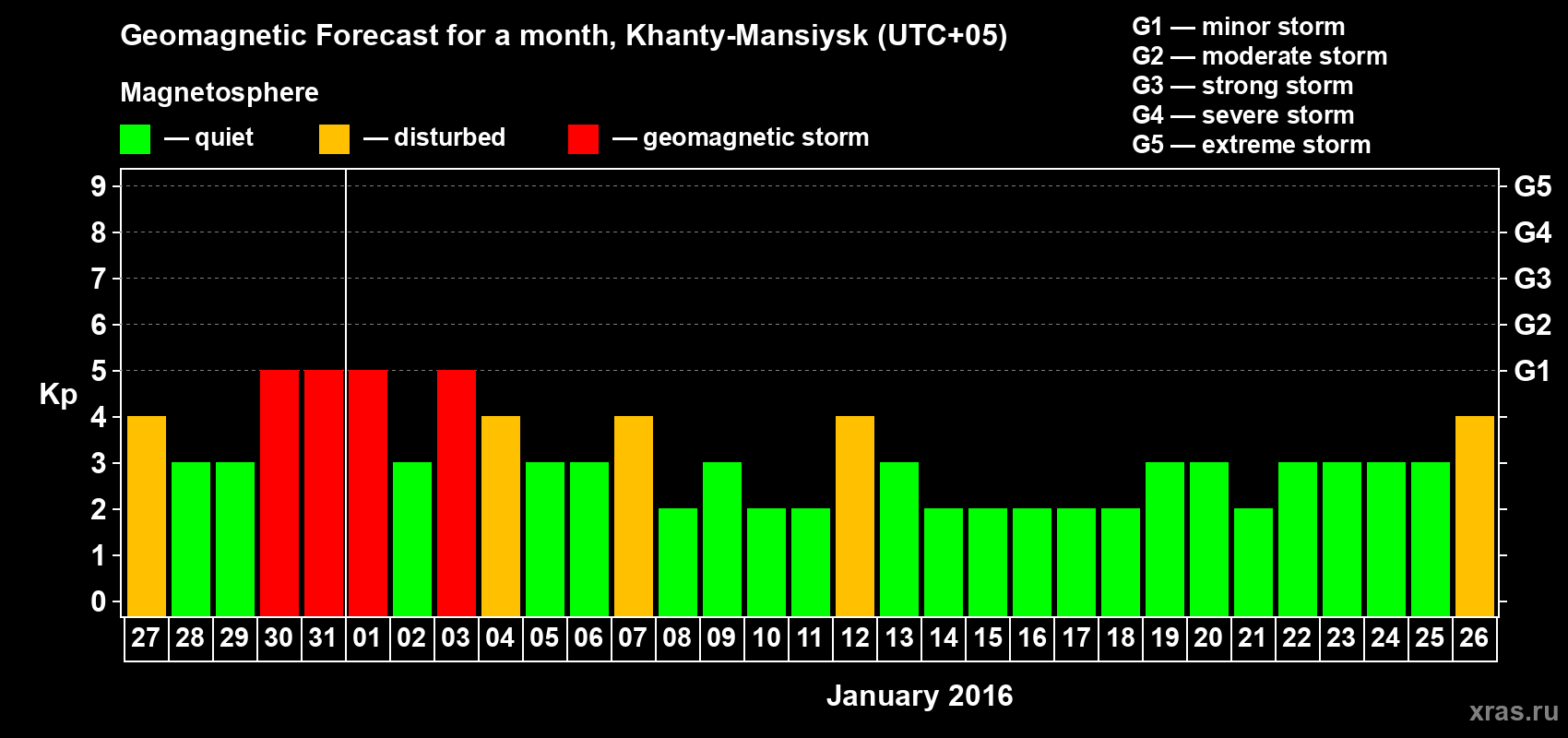 Geomagnetic storm forecast in Khanty-Mansiysk for Dec 27, 2015