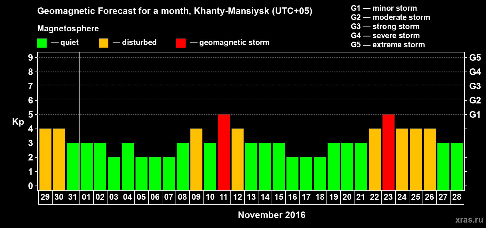 Geomagnetic storm forecast in Khanty-Mansiysk for Oct 29, 2016