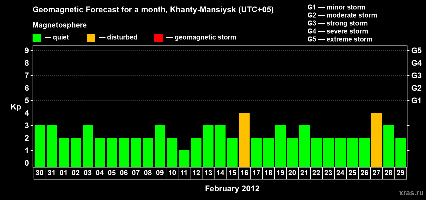 Geomagnetic storm forecast in Khanty-Mansiysk for Jan 30, 2012