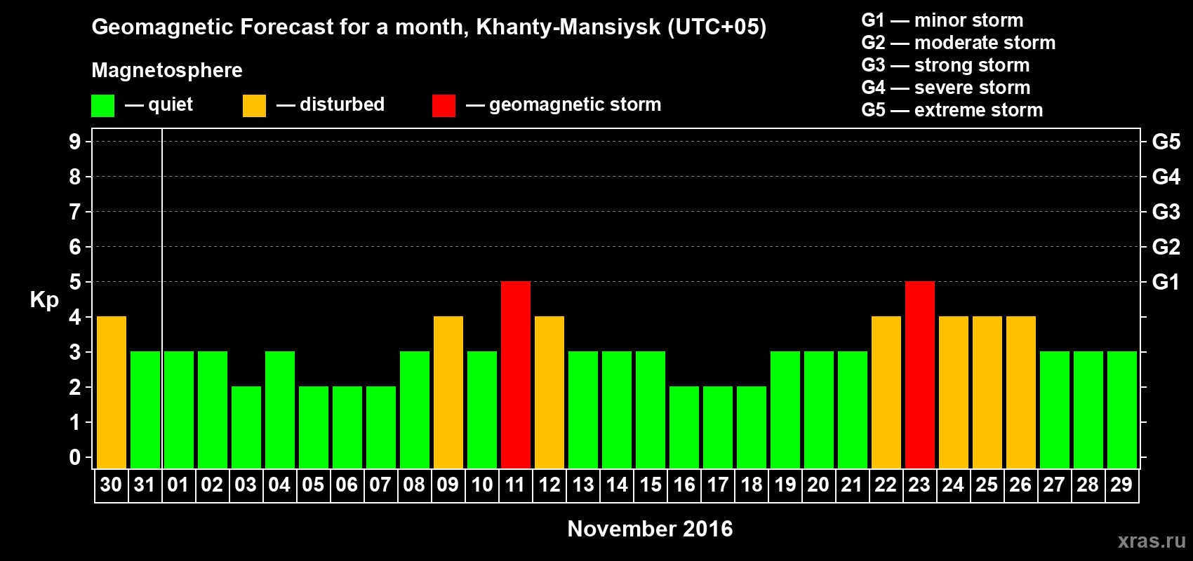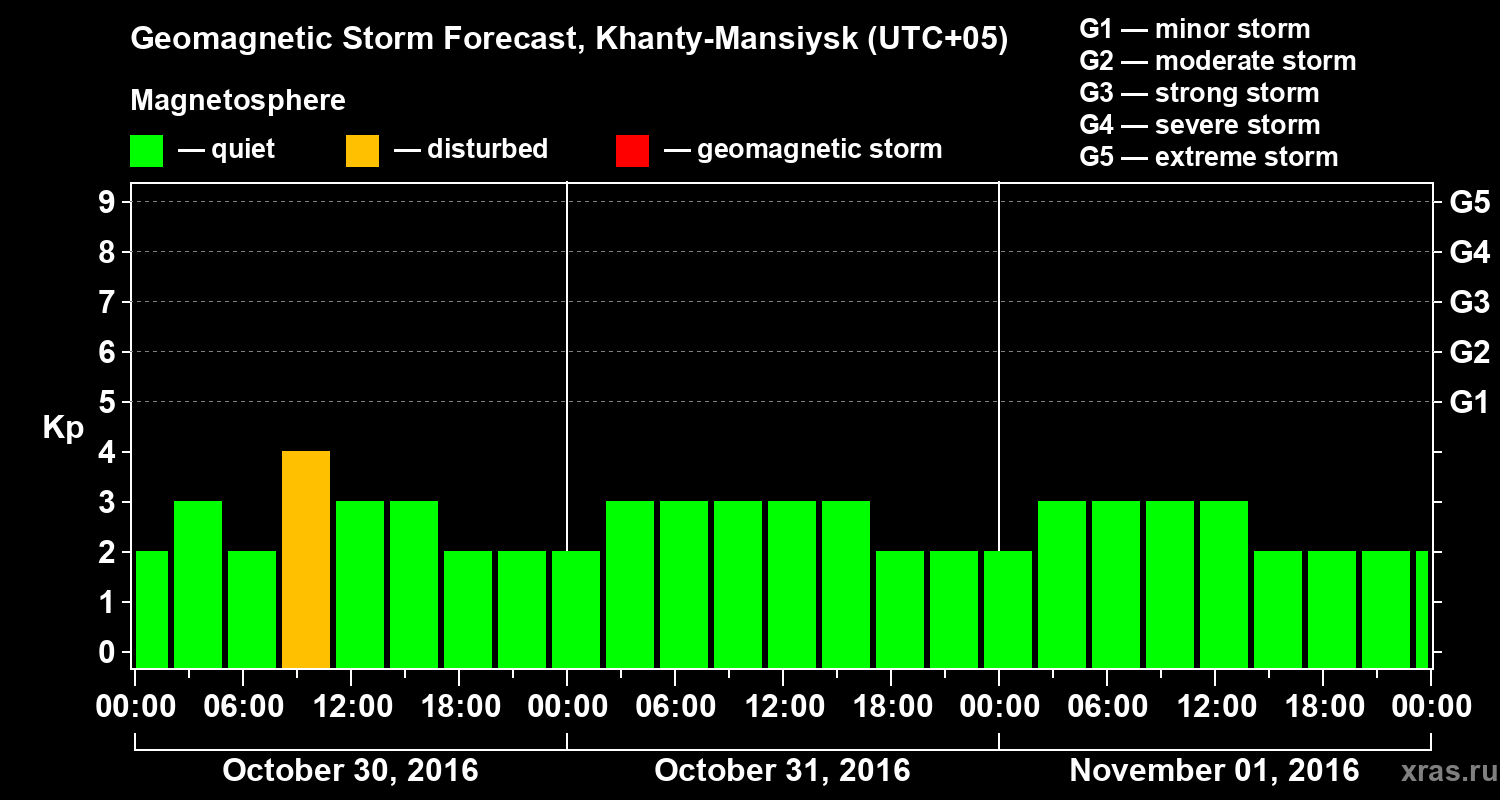 Geomagnetic storm forecast in Khanty-Mansiysk for Oct 30, 2016