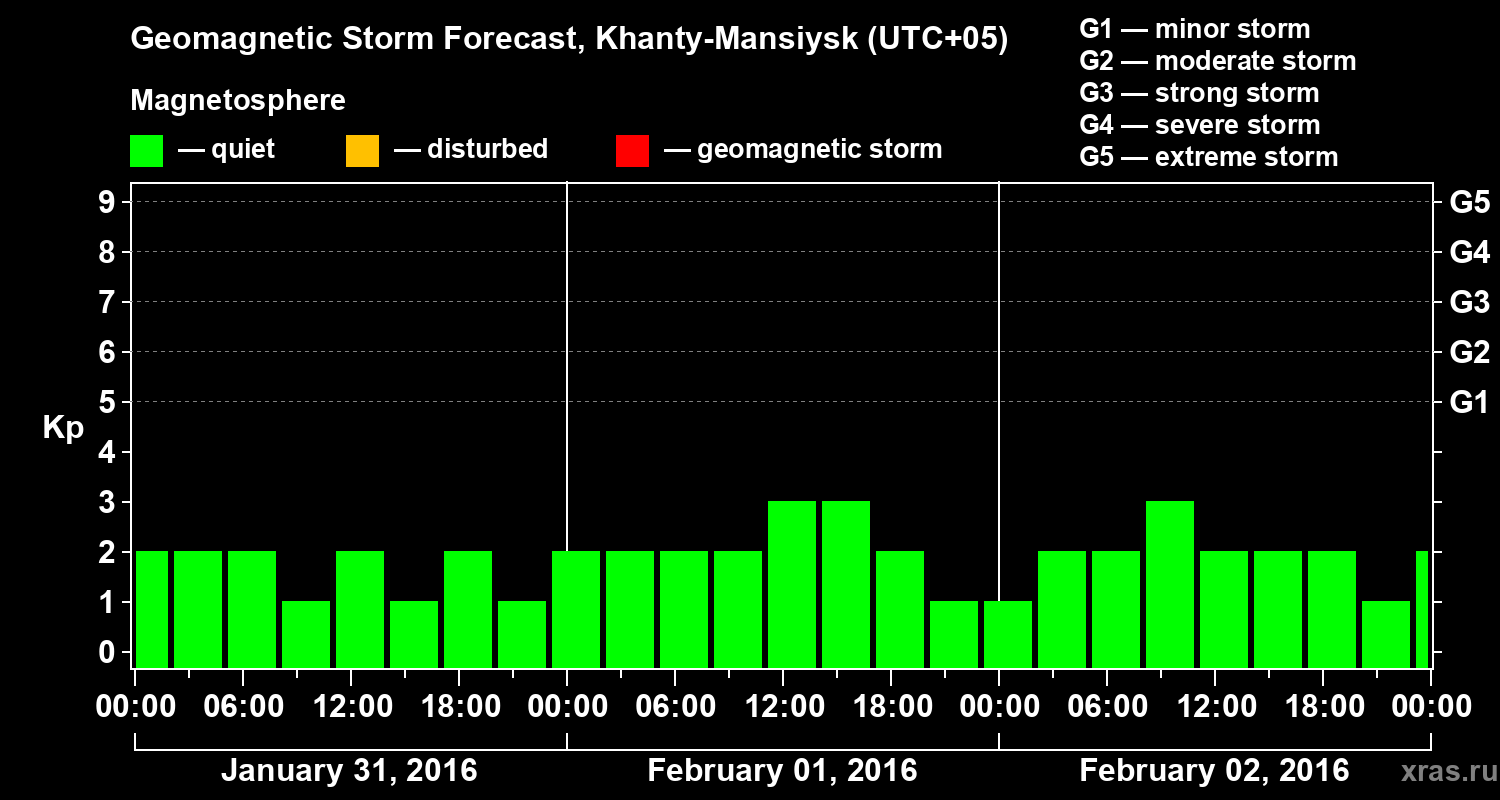 Geomagnetic storm forecast in Khanty-Mansiysk for Jan 31, 2016