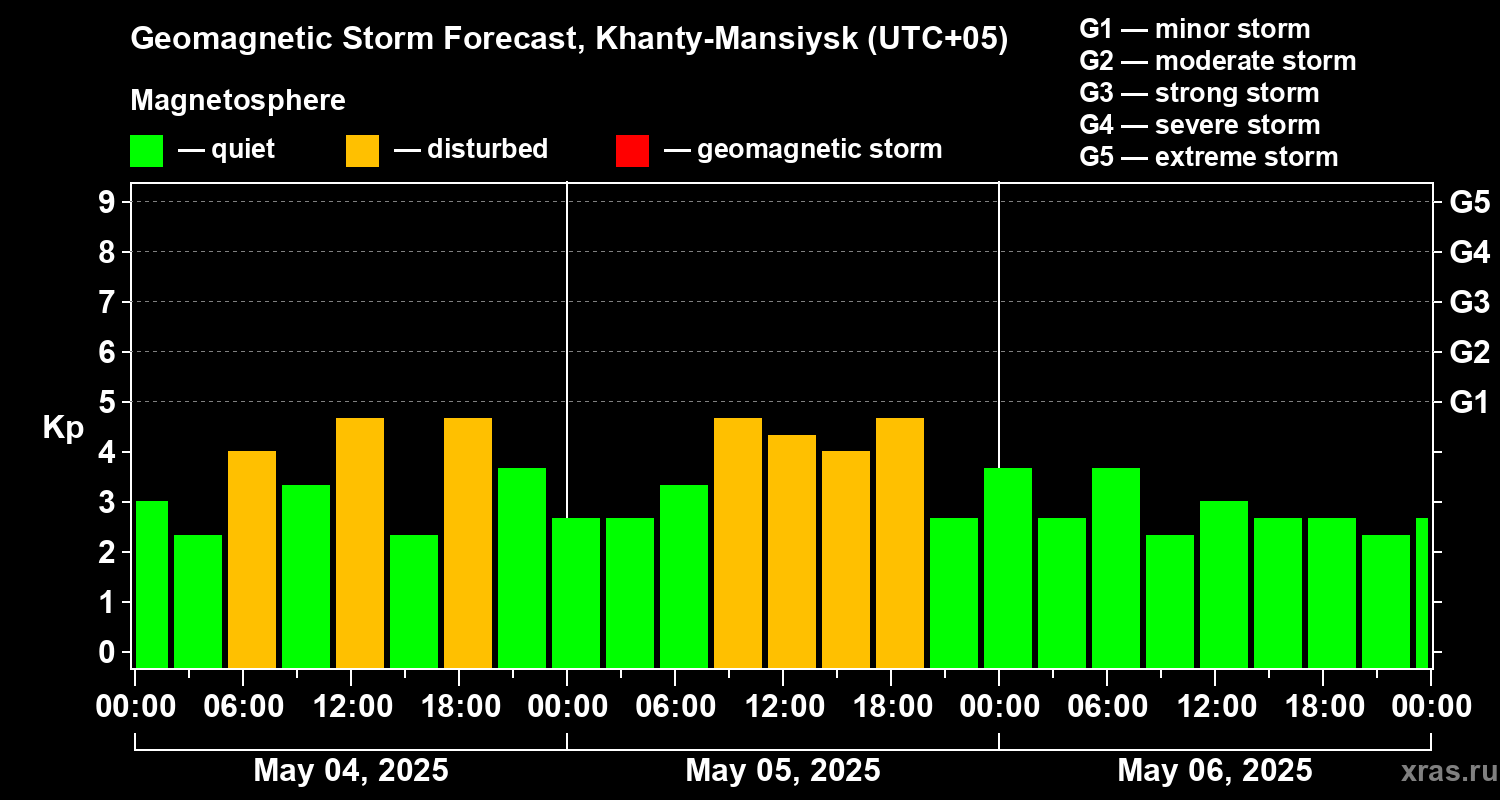 Geomagnetic activity forecast in Khanty-Mansiysk — May 04, 2025