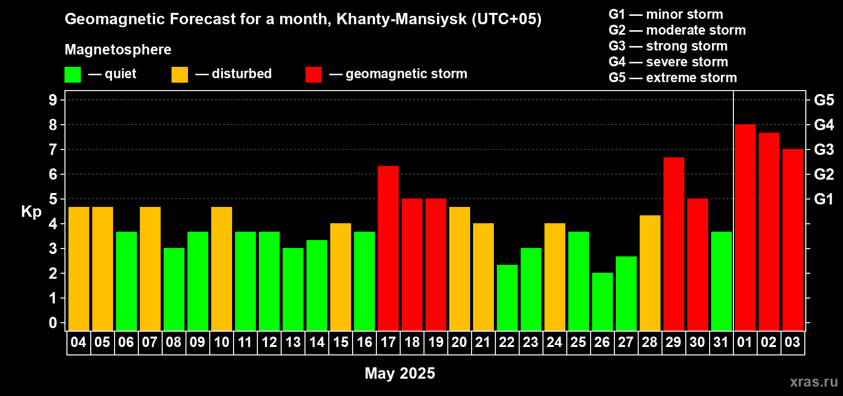 Geomagnetic storm forecast in Khanty-Mansiysk for May 04, 2025