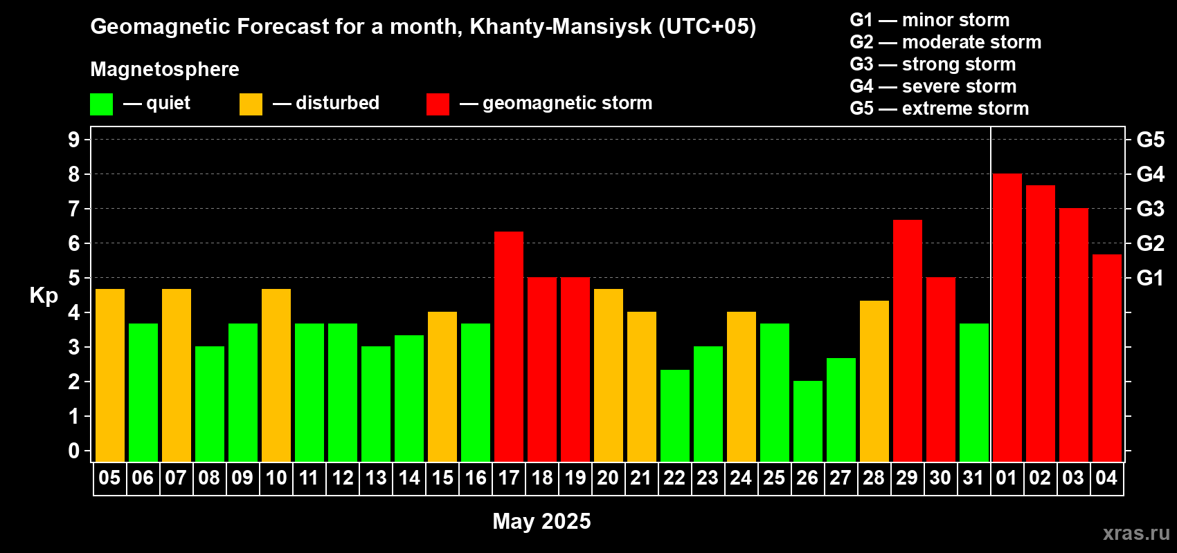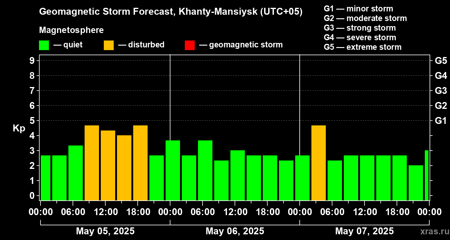 Geomagnetic activity forecast in Khanty-Mansiysk — May 05, 2025