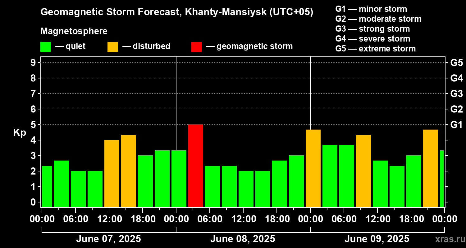 Geomagnetic storm forecast in Khanty-Mansiysk for Jun 07, 2025