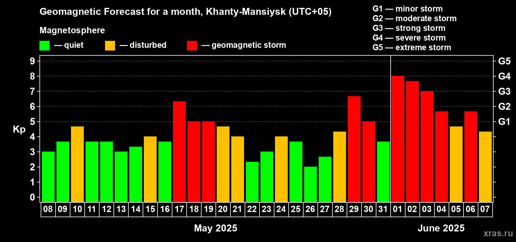Geomagnetic storm forecast in Khanty-Mansiysk for May 08, 2025