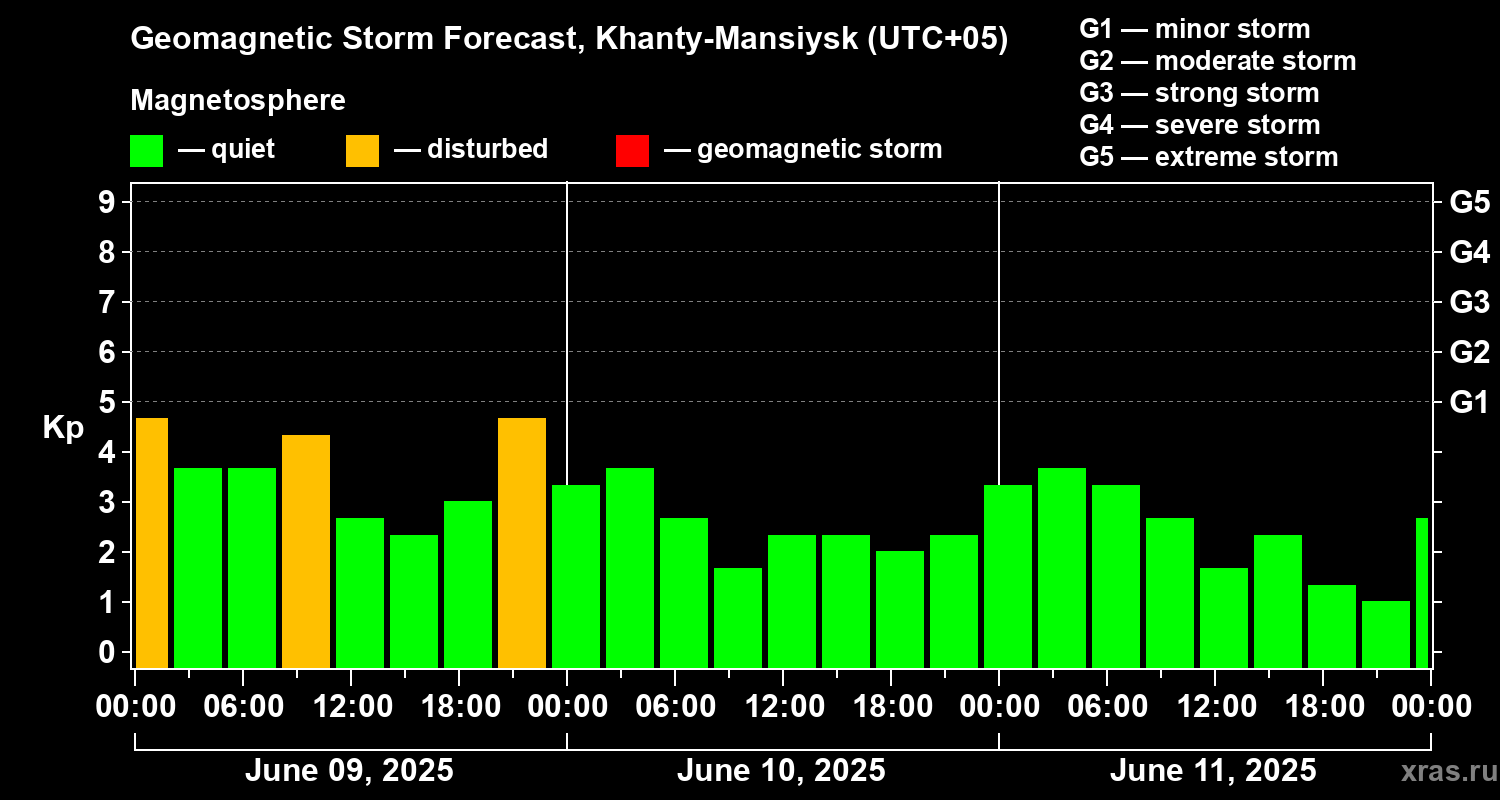 Geomagnetic activity forecast in Khanty-Mansiysk — Jun 09, 2025