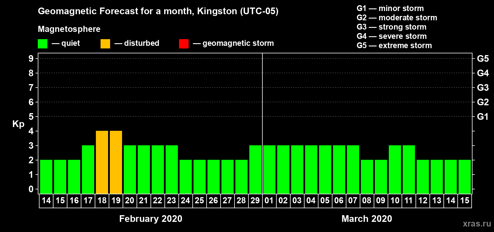 Geomagnetic storm forecast in Kingston for Feb 14, 2020
