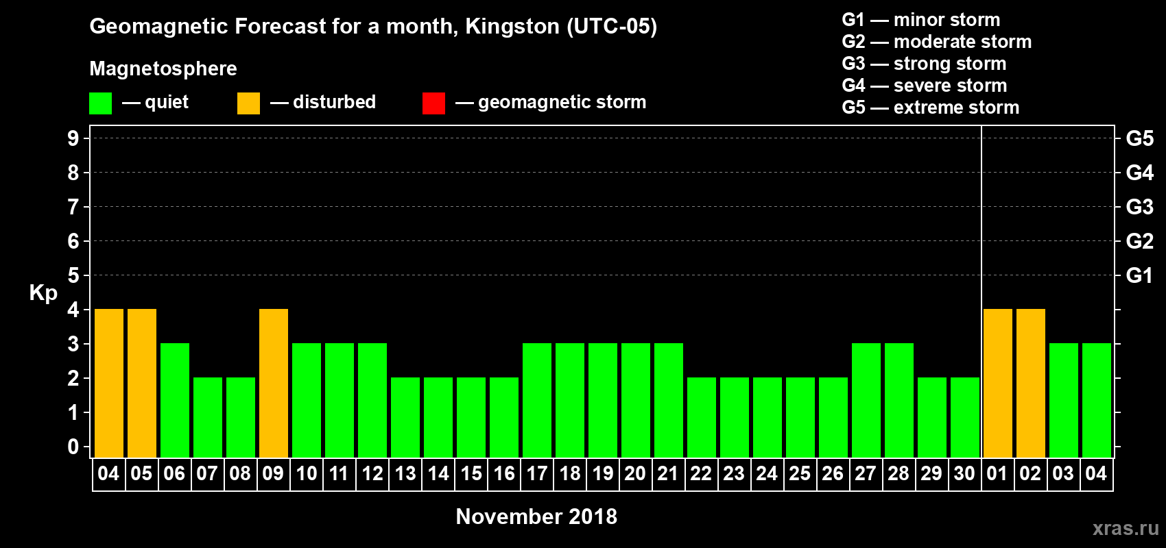Geomagnetic storm forecast in Kingston for Nov 04, 2018