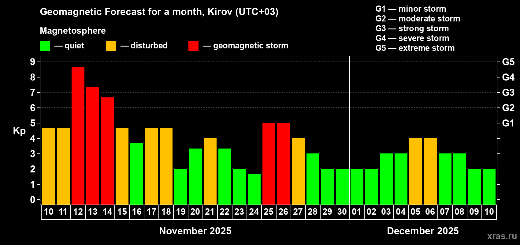 Geomagnetic storm forecast in Kirov for Nov 10, 2025