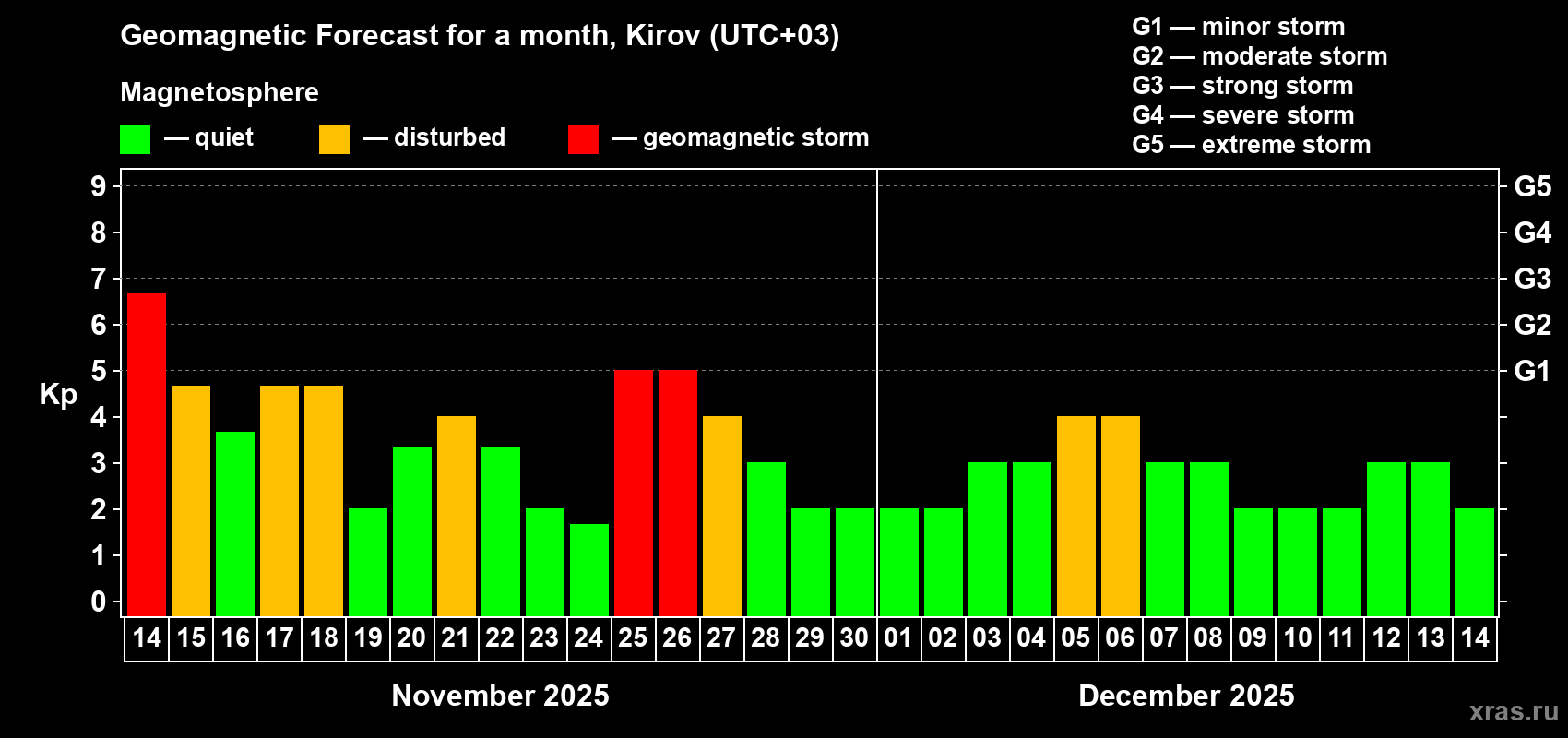 Geomagnetic storm forecast in Kirov for Nov 14, 2025