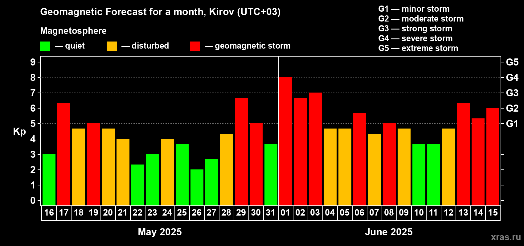 Geomagnetic storm forecast in Kirov for May 16, 2025