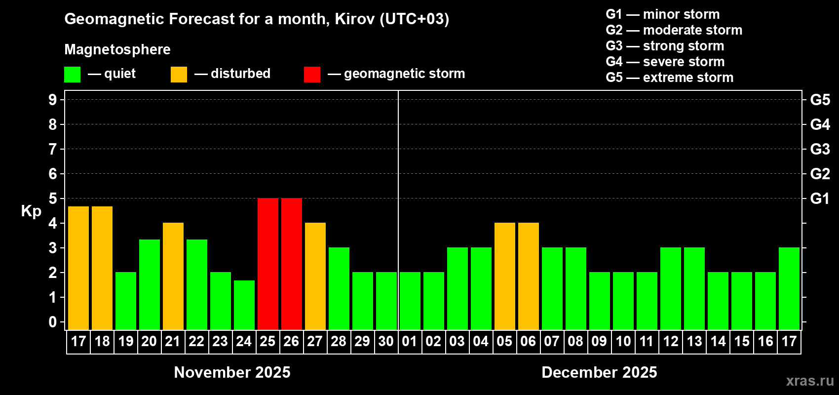 Geomagnetic storm forecast in Kirov for Nov 17, 2025