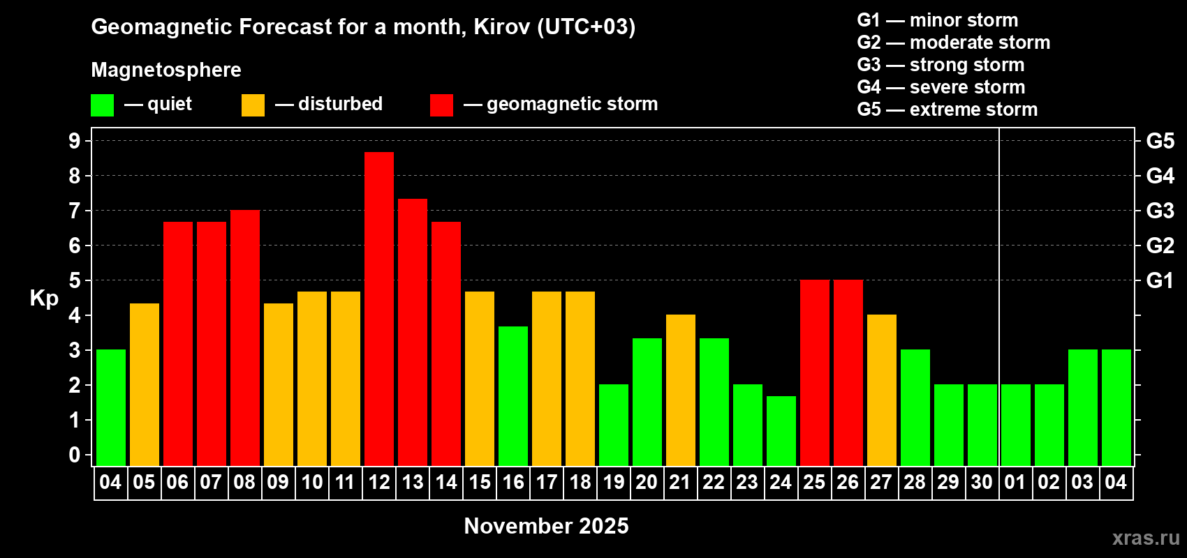Geomagnetic storm forecast in Kirov for Nov 04, 2025