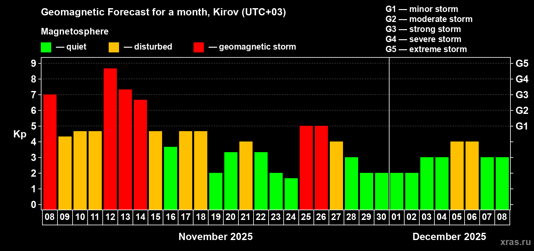 Geomagnetic storm forecast in Kirov for Nov 08, 2025