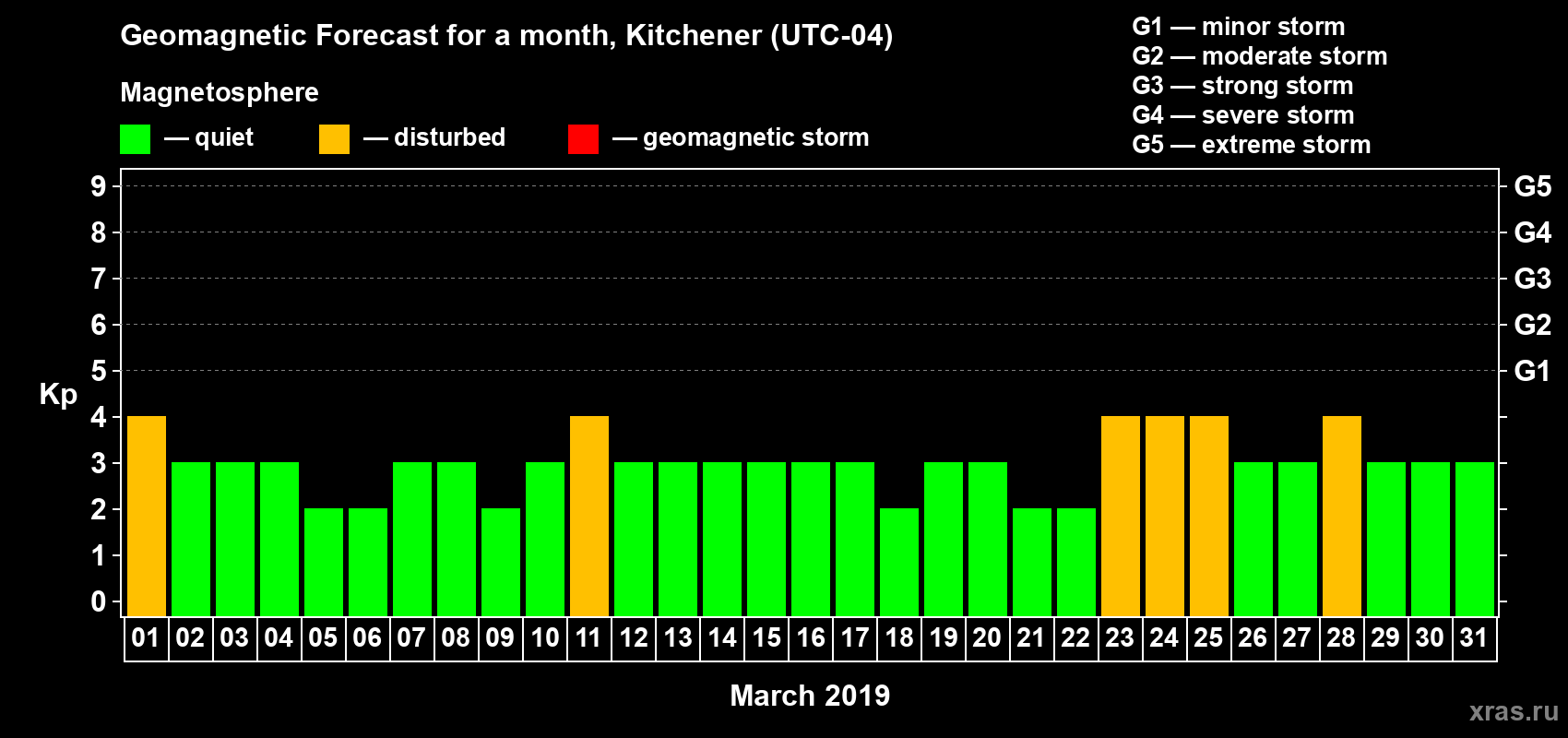 Geomagnetic storm forecast in Kitchener for Mar 01, 2019