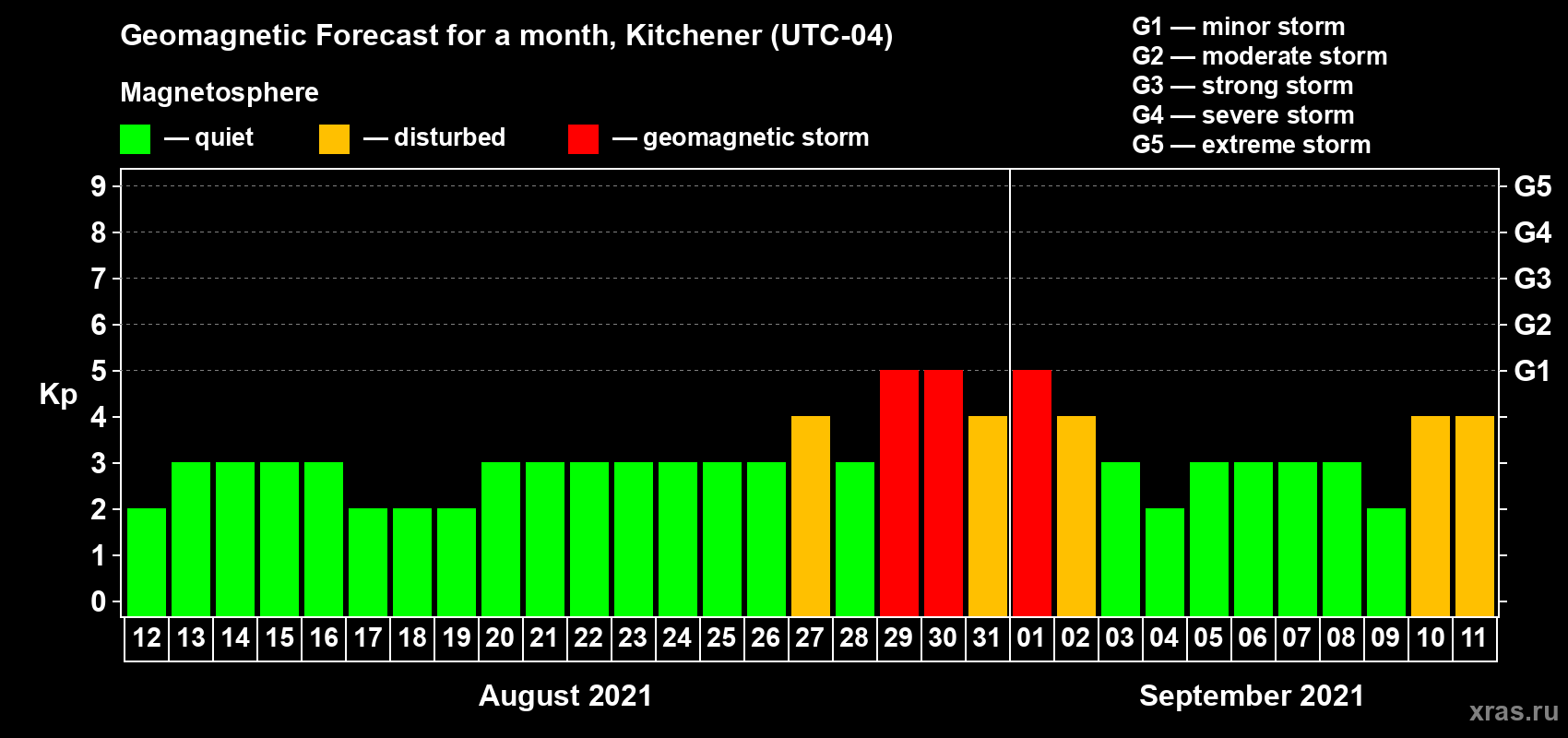 Geomagnetic storm forecast in Kitchener for Aug 12, 2021