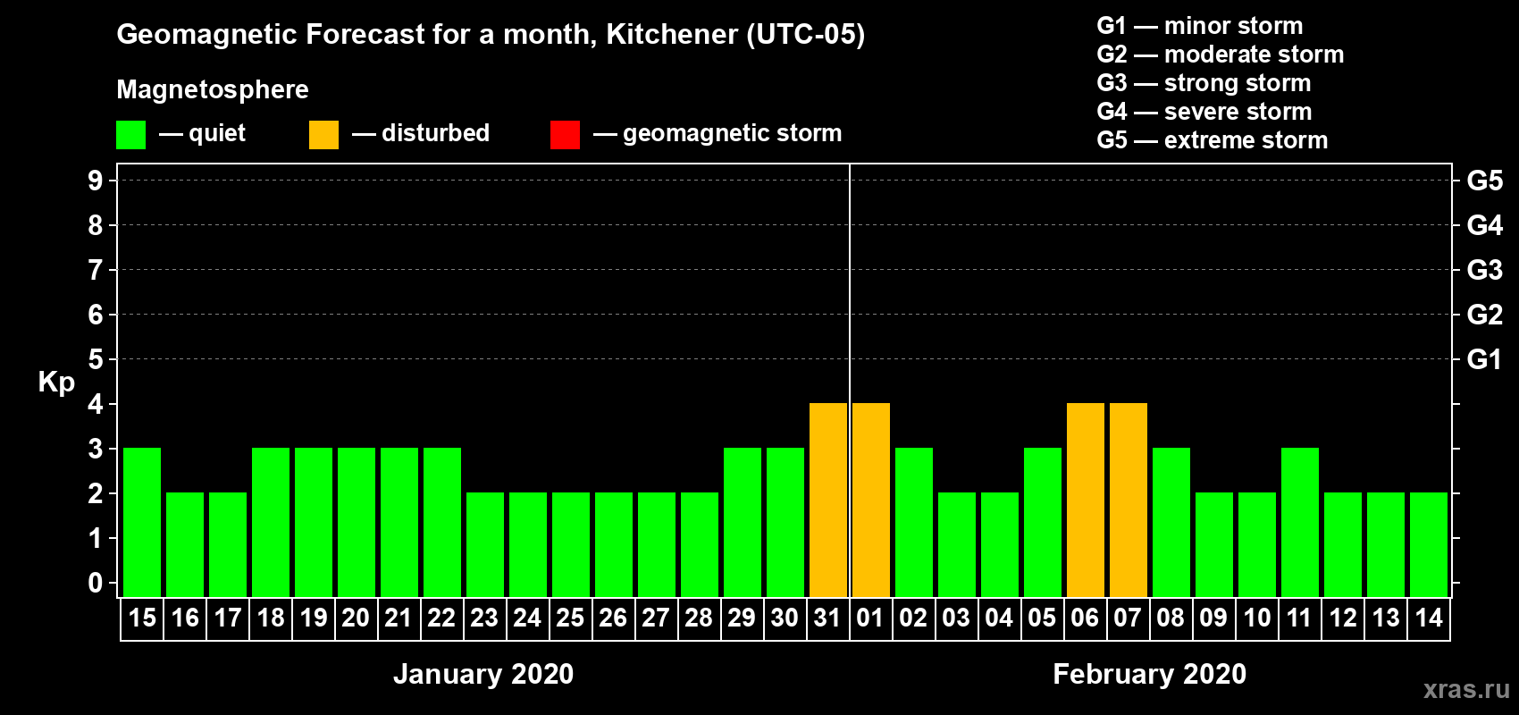 Geomagnetic storm forecast in Kitchener for Jan 15, 2020