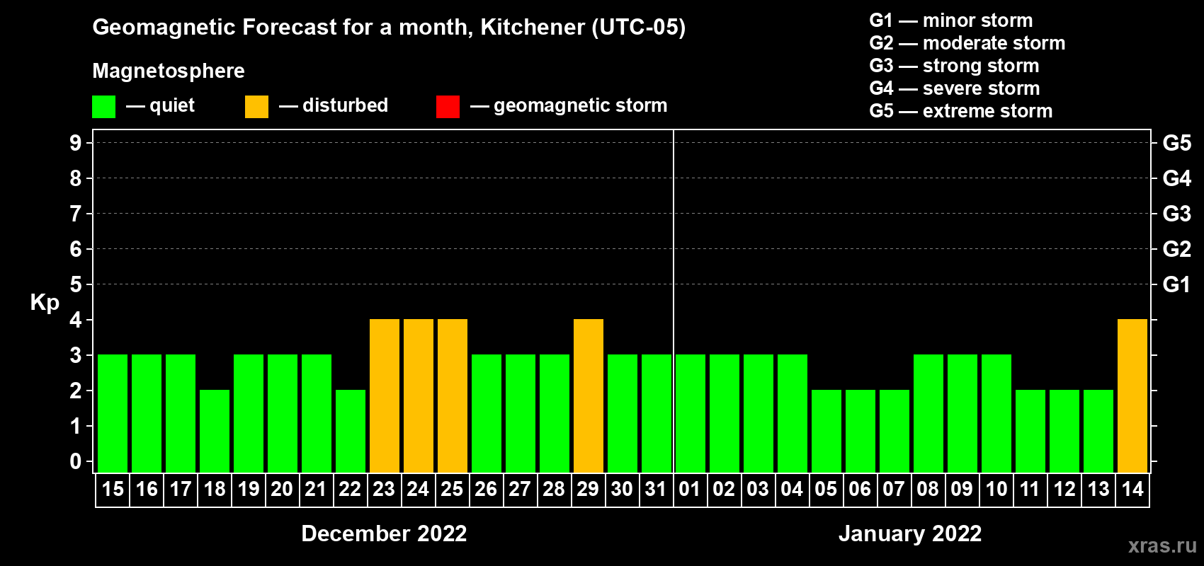 Geomagnetic storm forecast in Kitchener for Dec 15, 2021