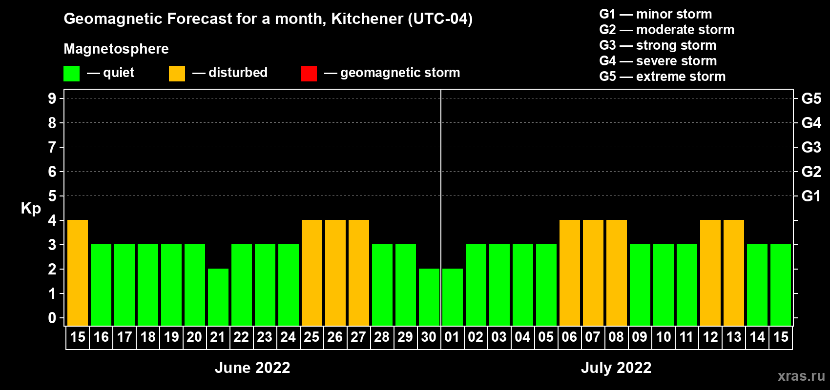 Geomagnetic storm forecast in Kitchener for Jun 15, 2022