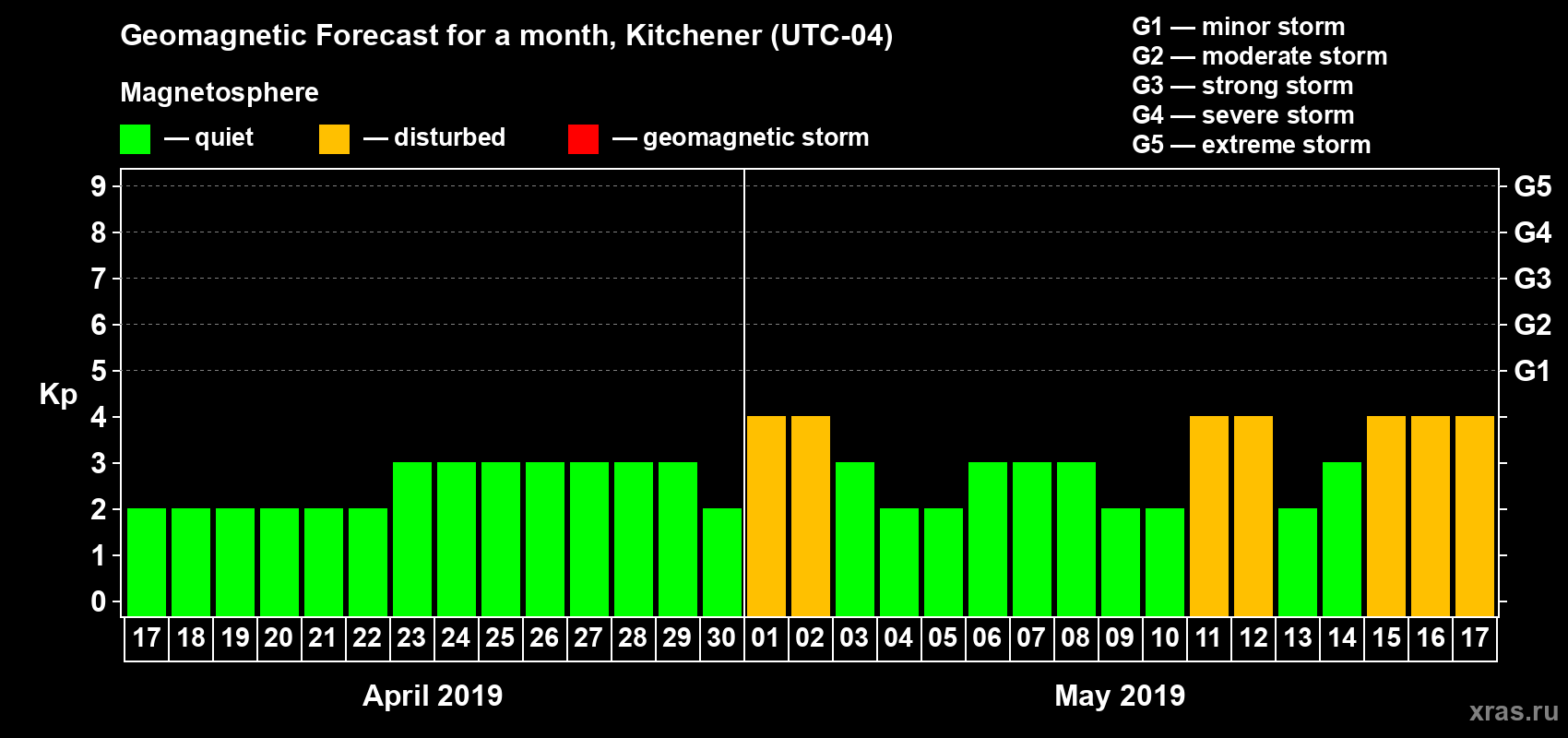 Geomagnetic storm forecast in Kitchener for Apr 17, 2019