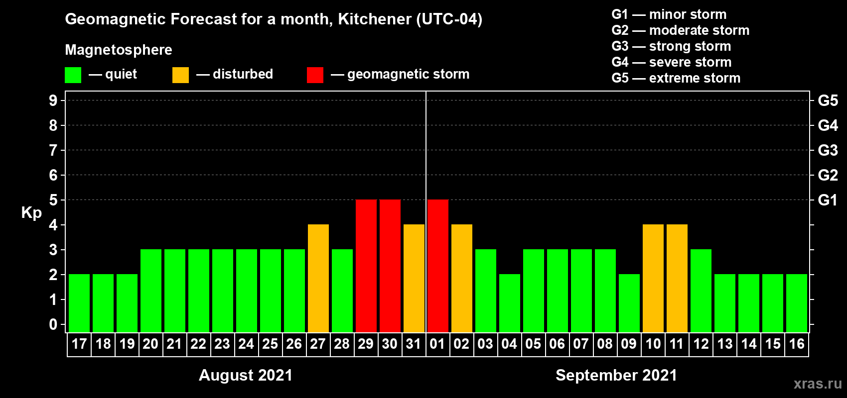 Geomagnetic storm forecast in Kitchener for Aug 17, 2021