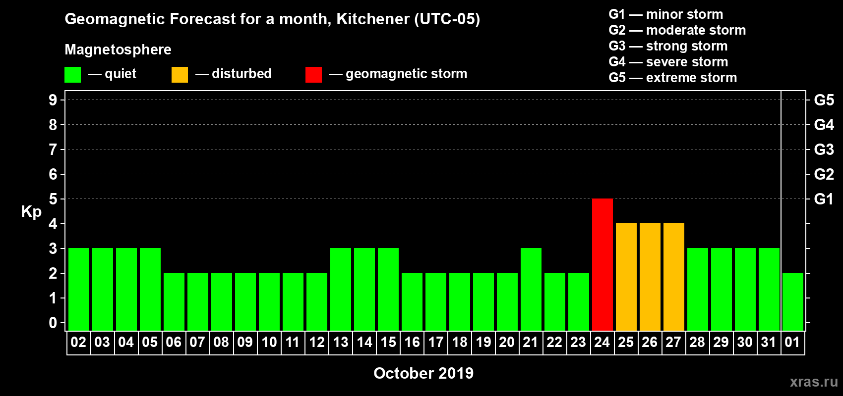 Geomagnetic storm forecast in Kitchener for Oct 02, 2019