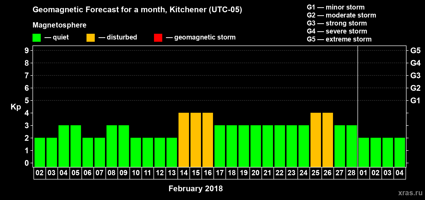 Geomagnetic storm forecast in Kitchener for Feb 02, 2018