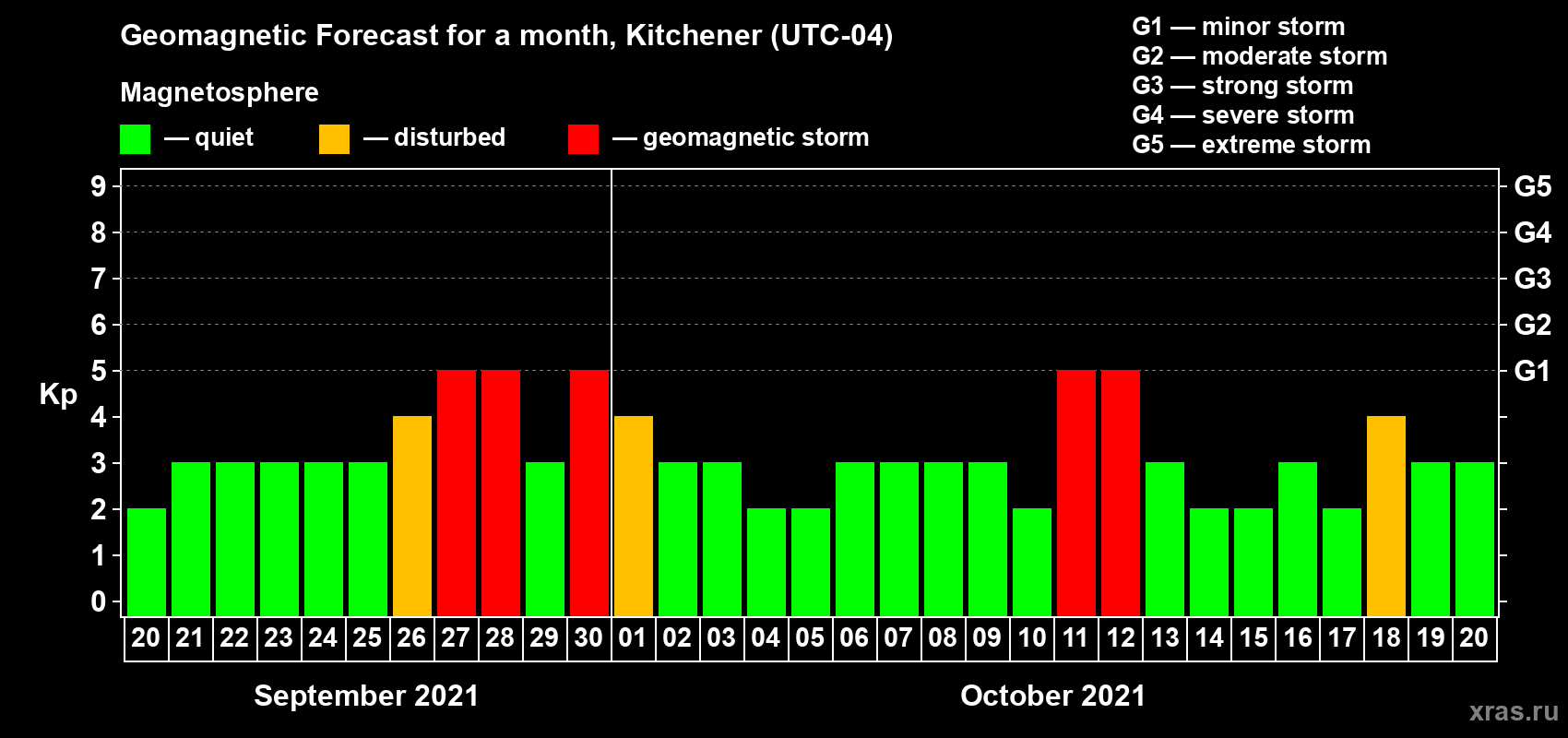 Geomagnetic storm forecast in Kitchener for Sep 20, 2021