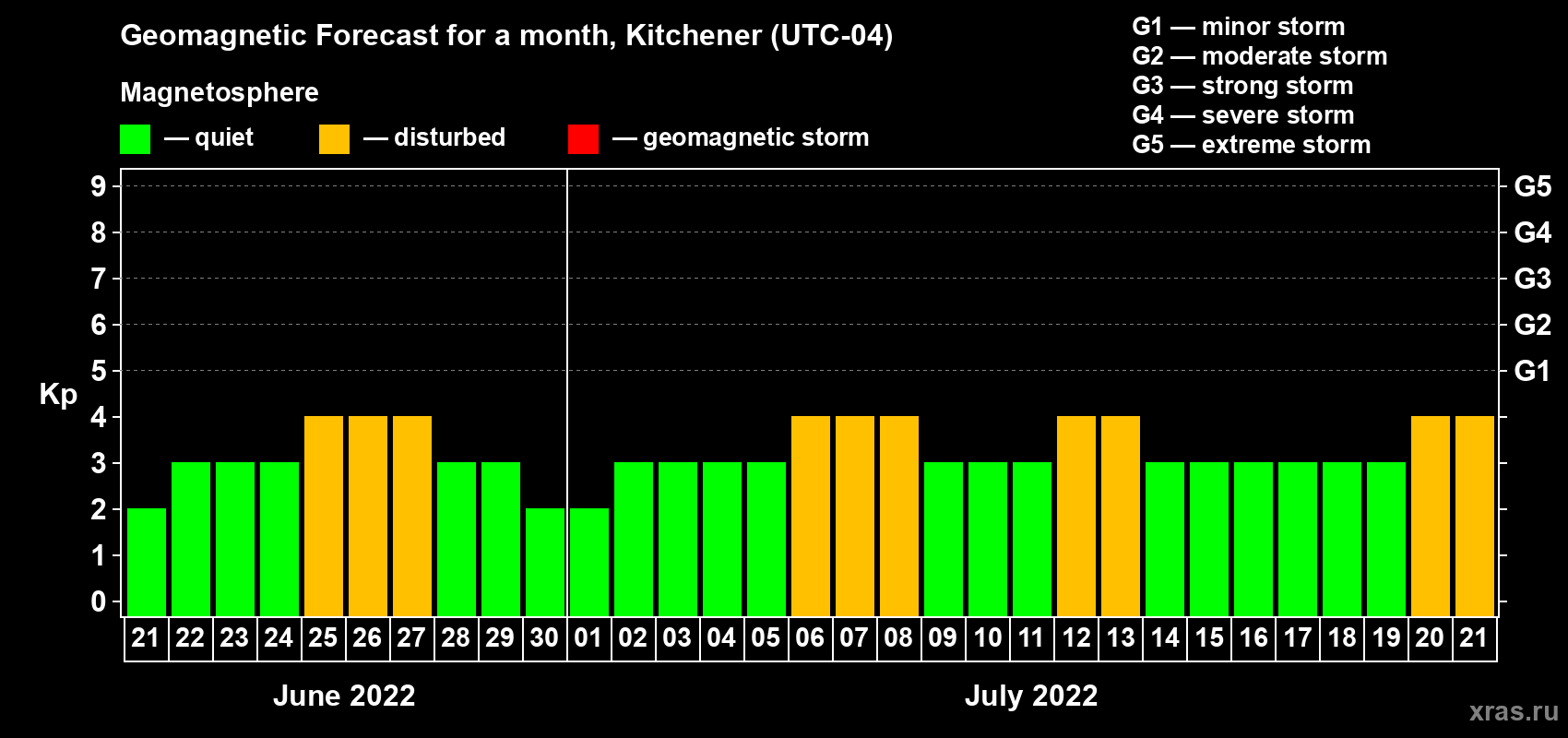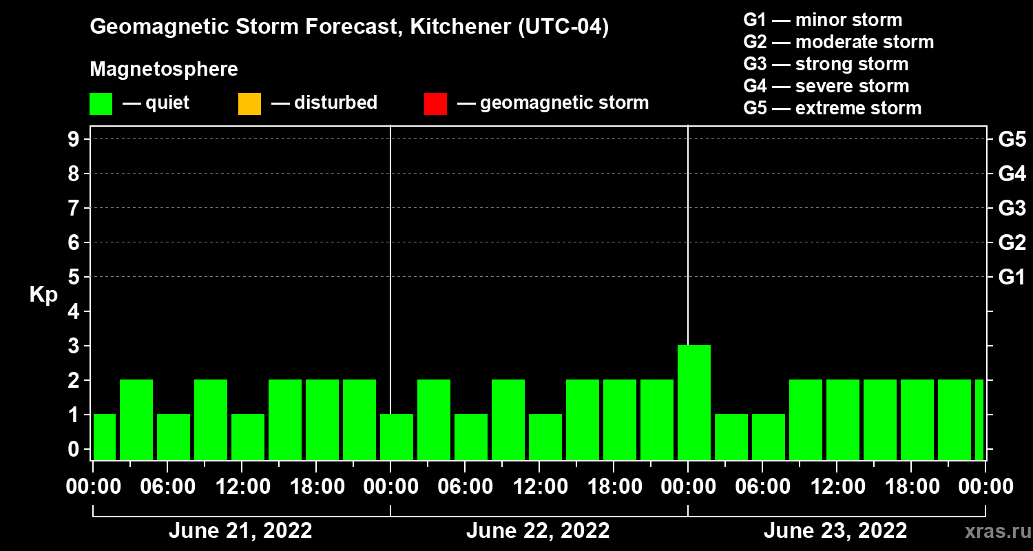 Geomagnetic storm forecast in Kitchener for Jun 21, 2022