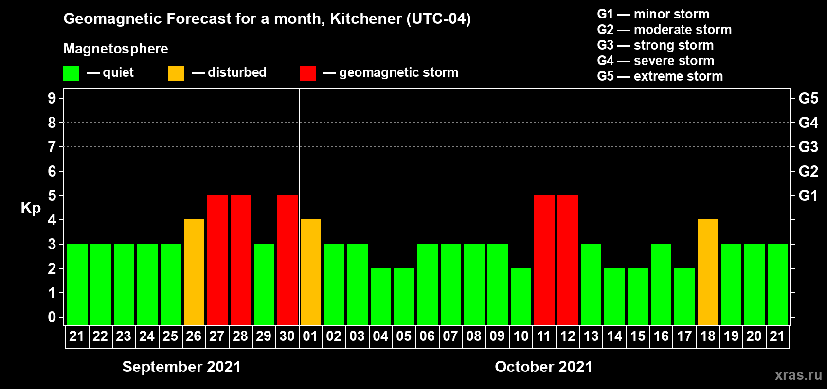 Geomagnetic storm forecast in Kitchener for Sep 21, 2021