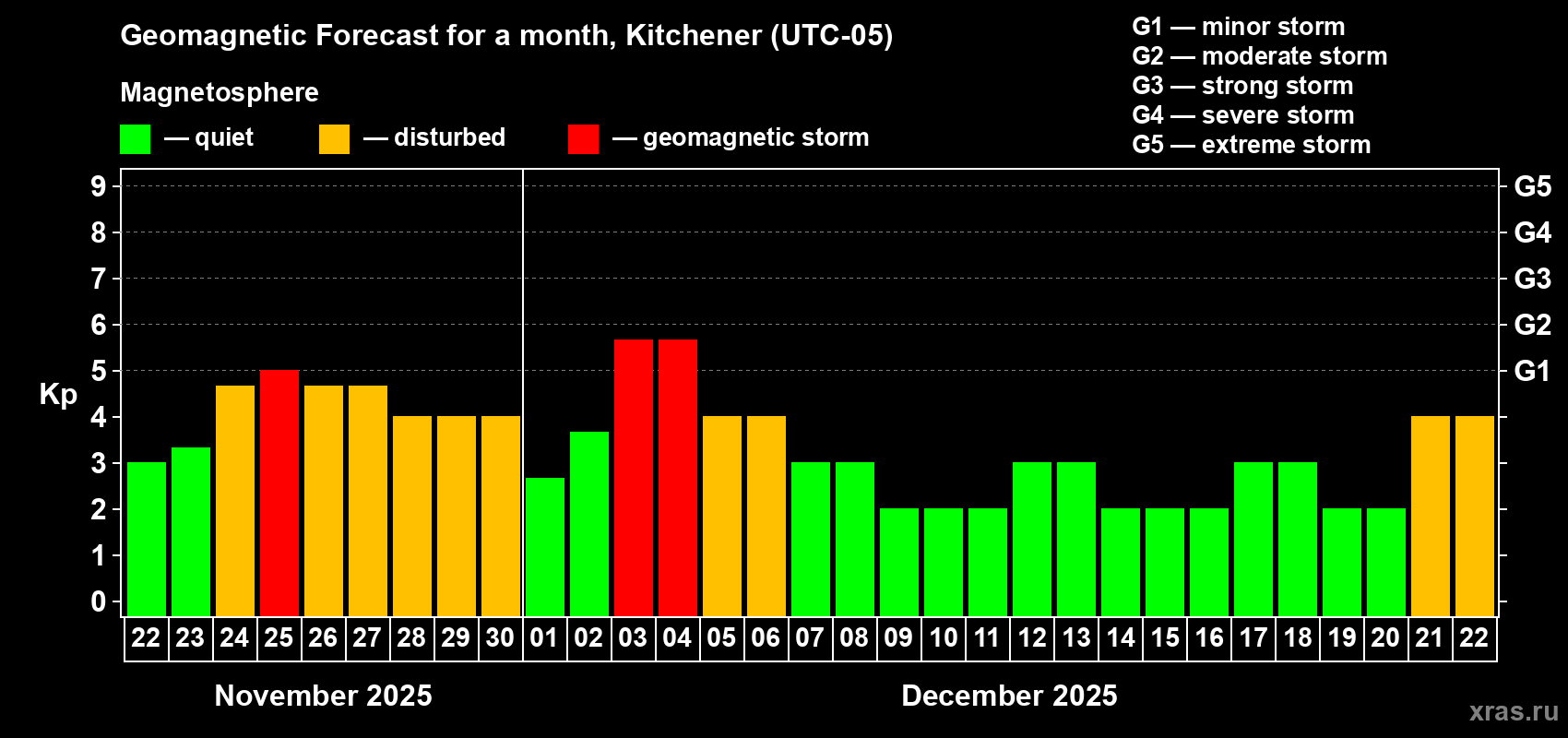 Geomagnetic storm forecast in Kitchener for Nov 22, 2025