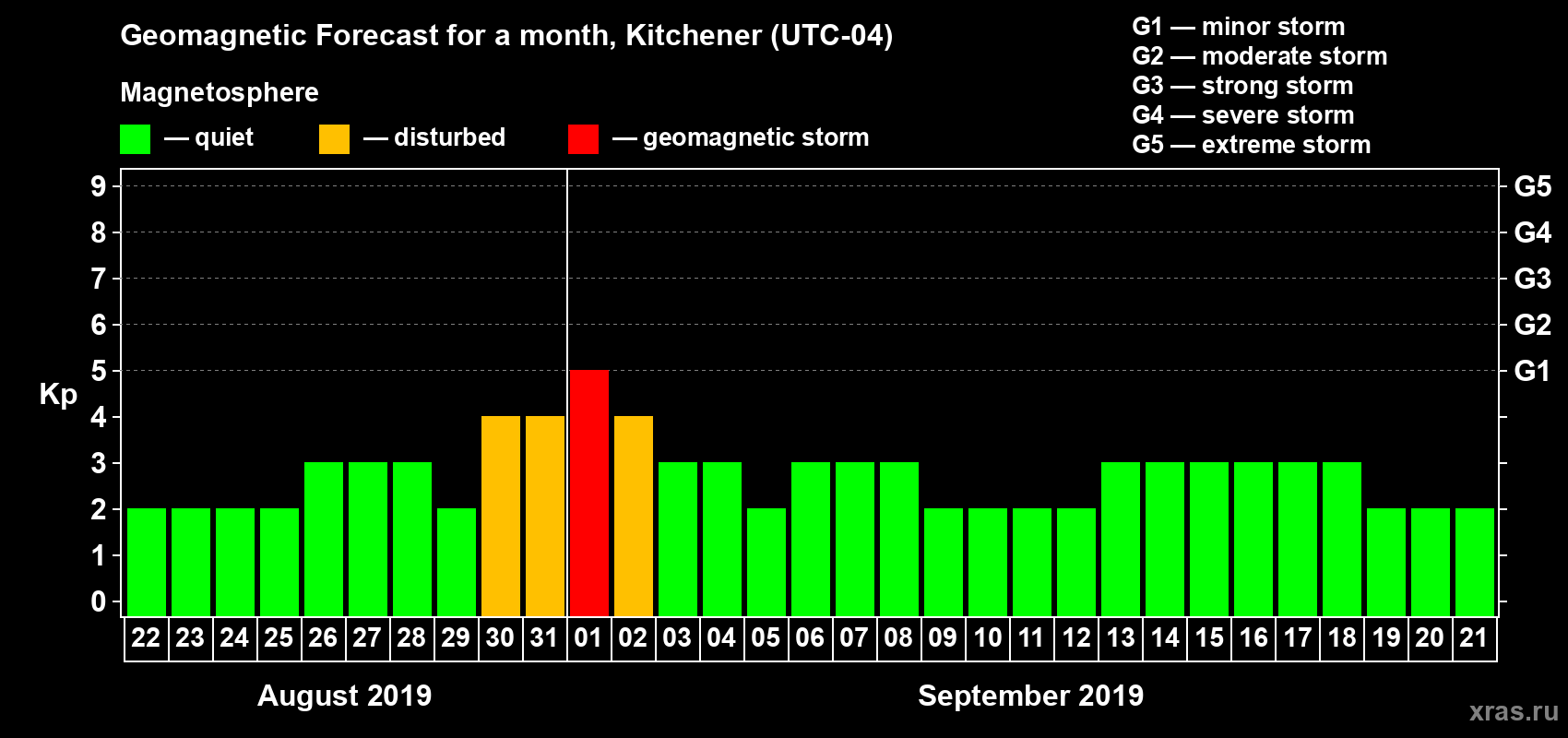 Geomagnetic storm forecast in Kitchener for Aug 22, 2019