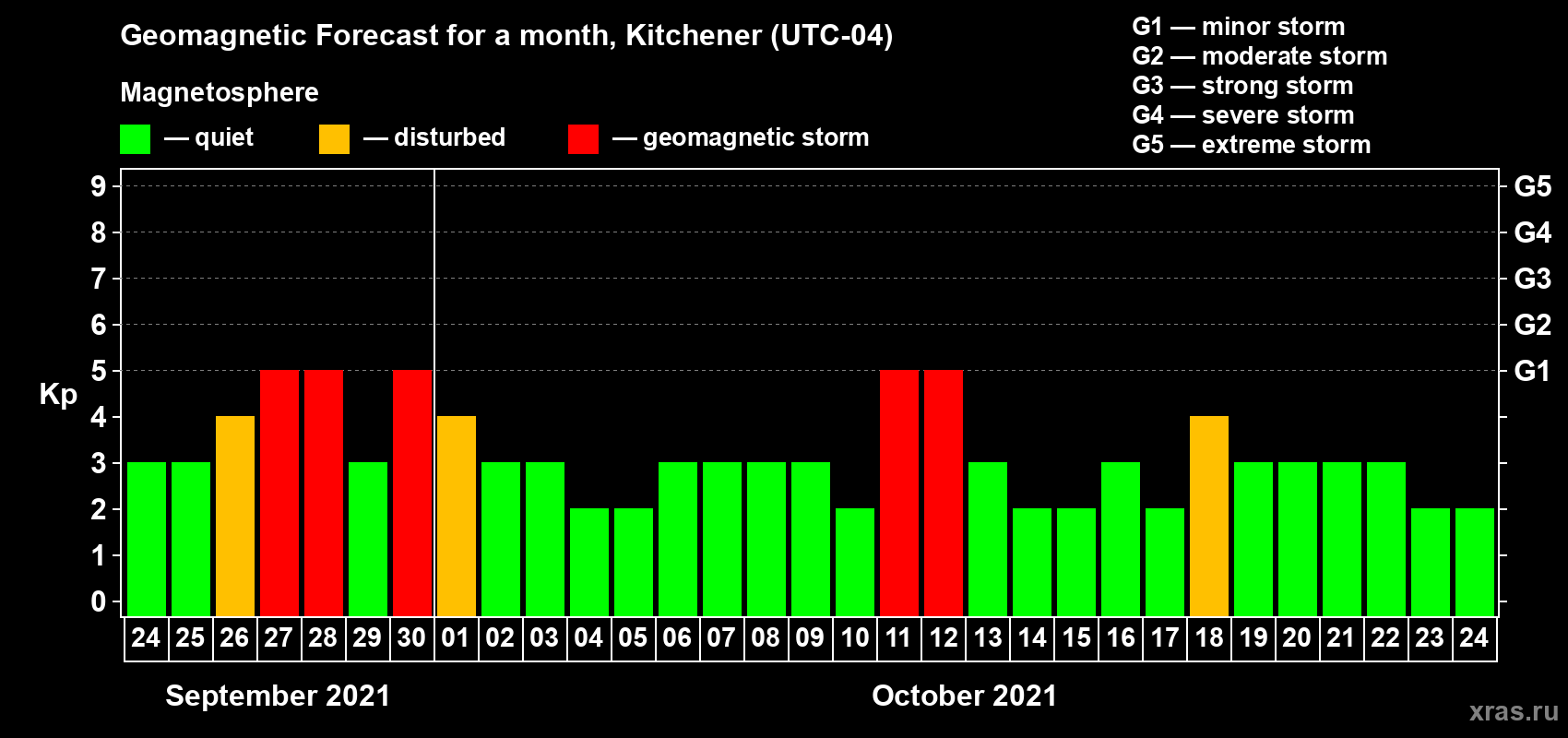 Geomagnetic storm forecast in Kitchener for Sep 24, 2021