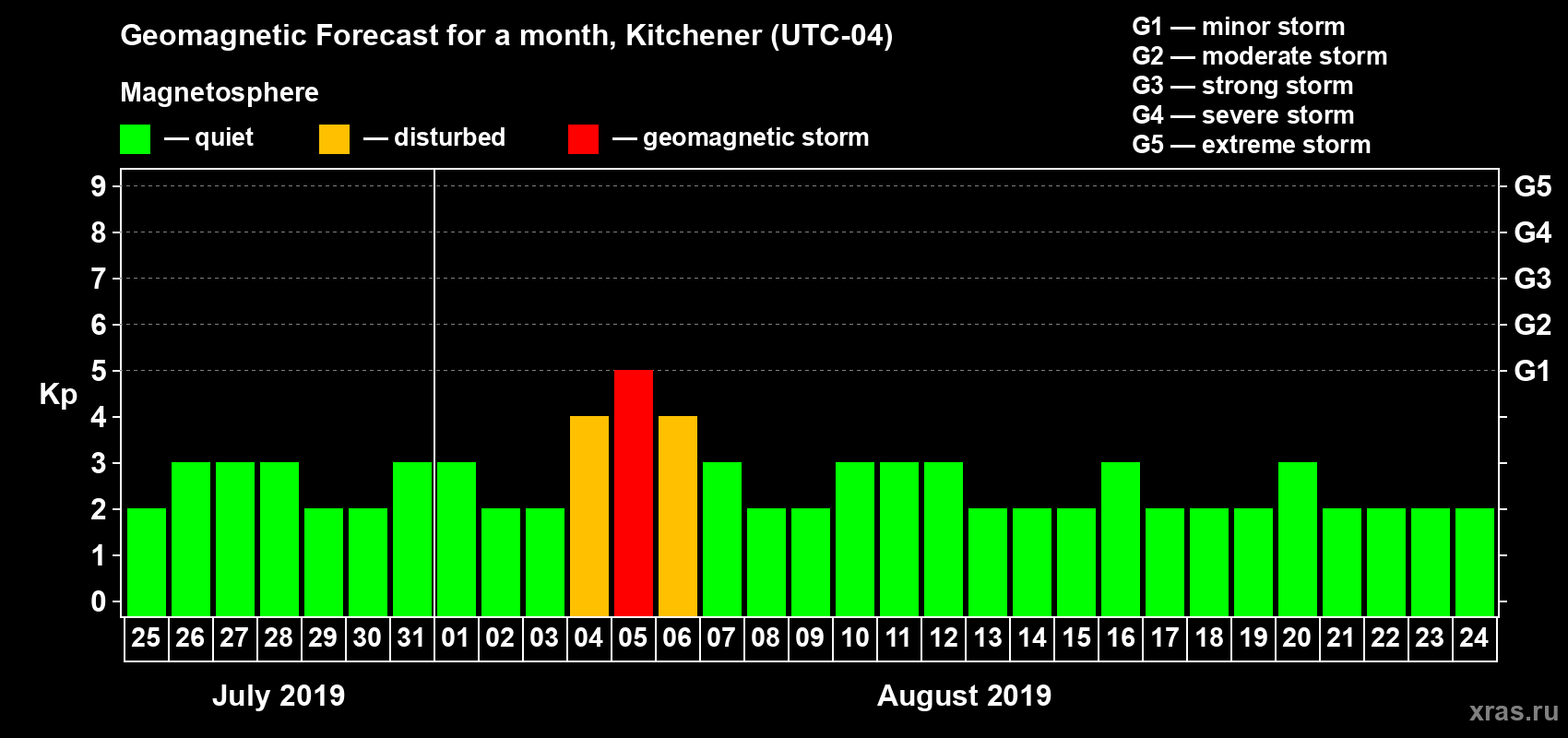 Geomagnetic storm forecast in Kitchener for Jul 25, 2019