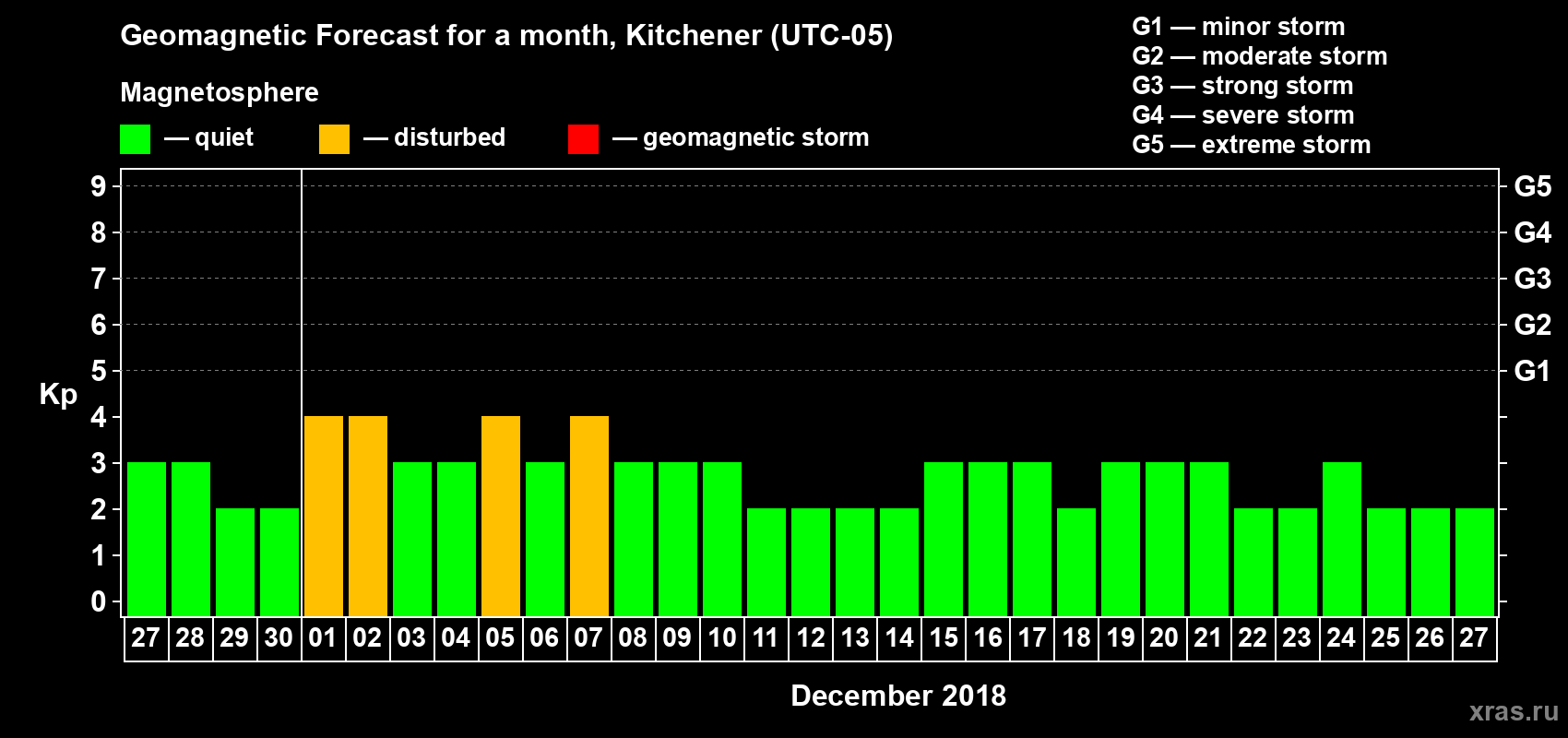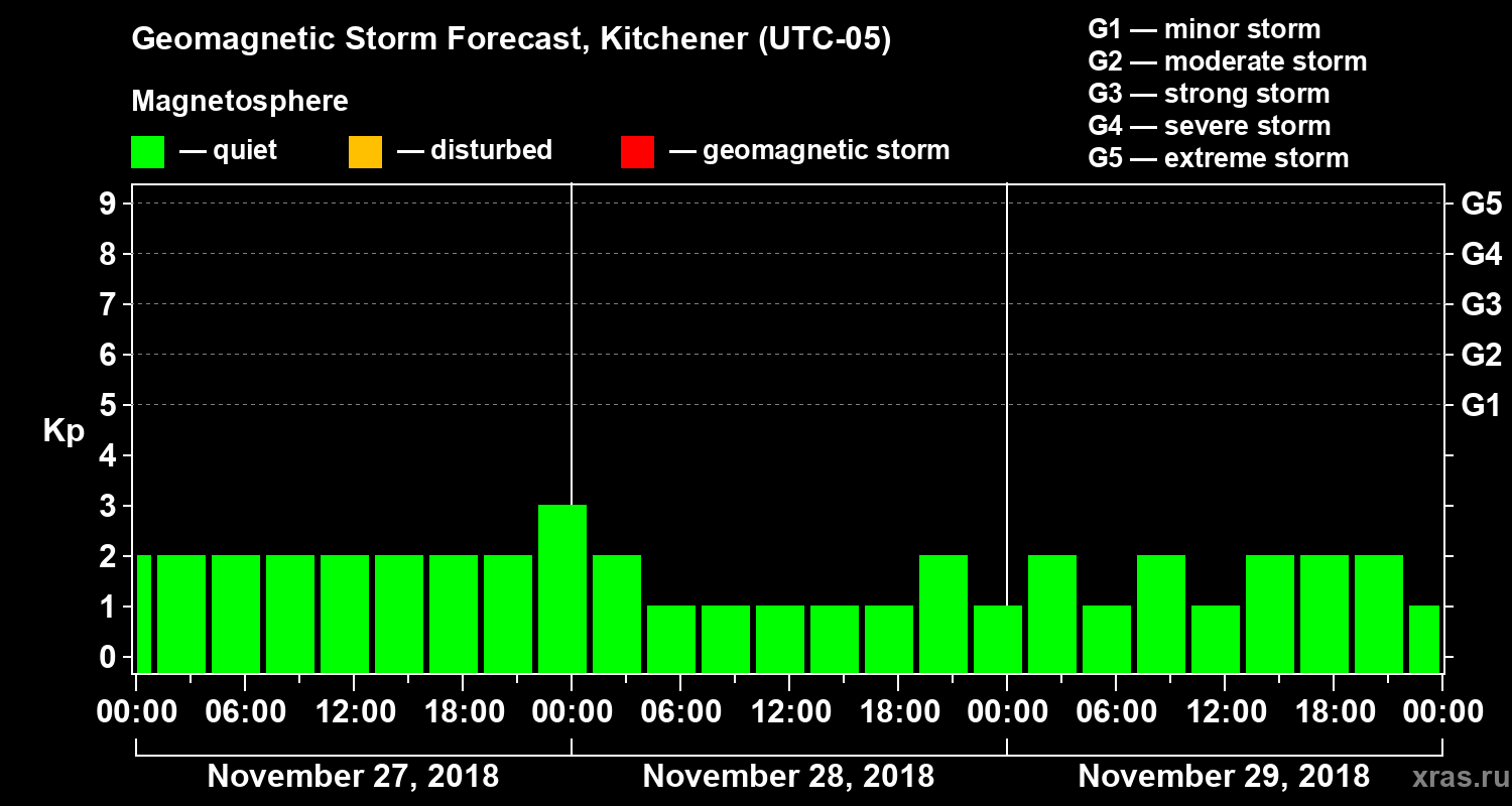 Geomagnetic storm forecast in Kitchener for Nov 27, 2018