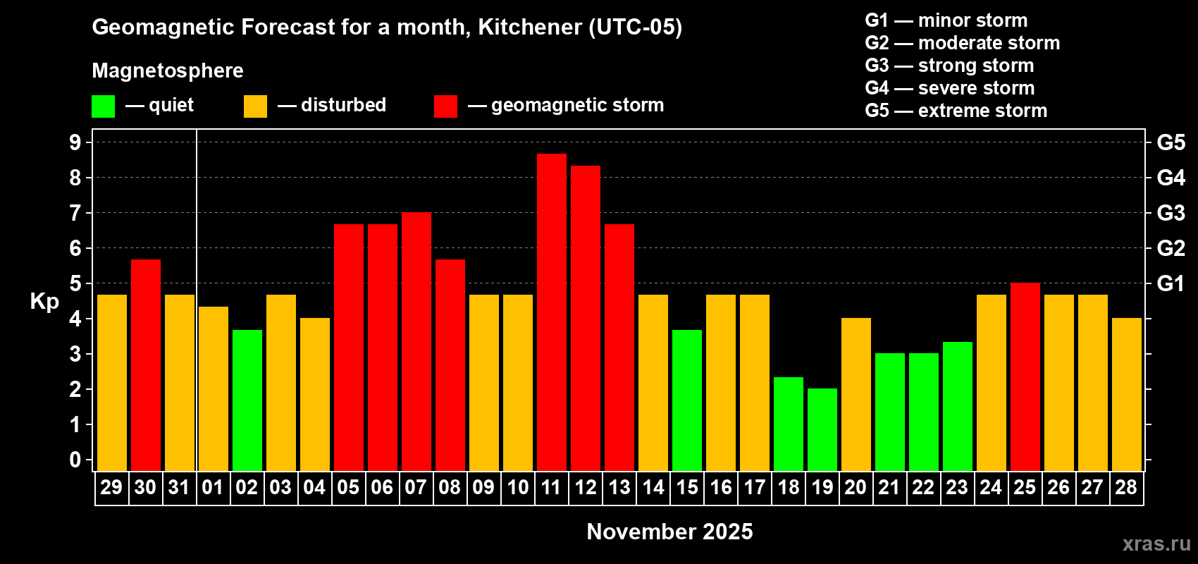 Geomagnetic storm forecast in Kitchener for Oct 29, 2025
