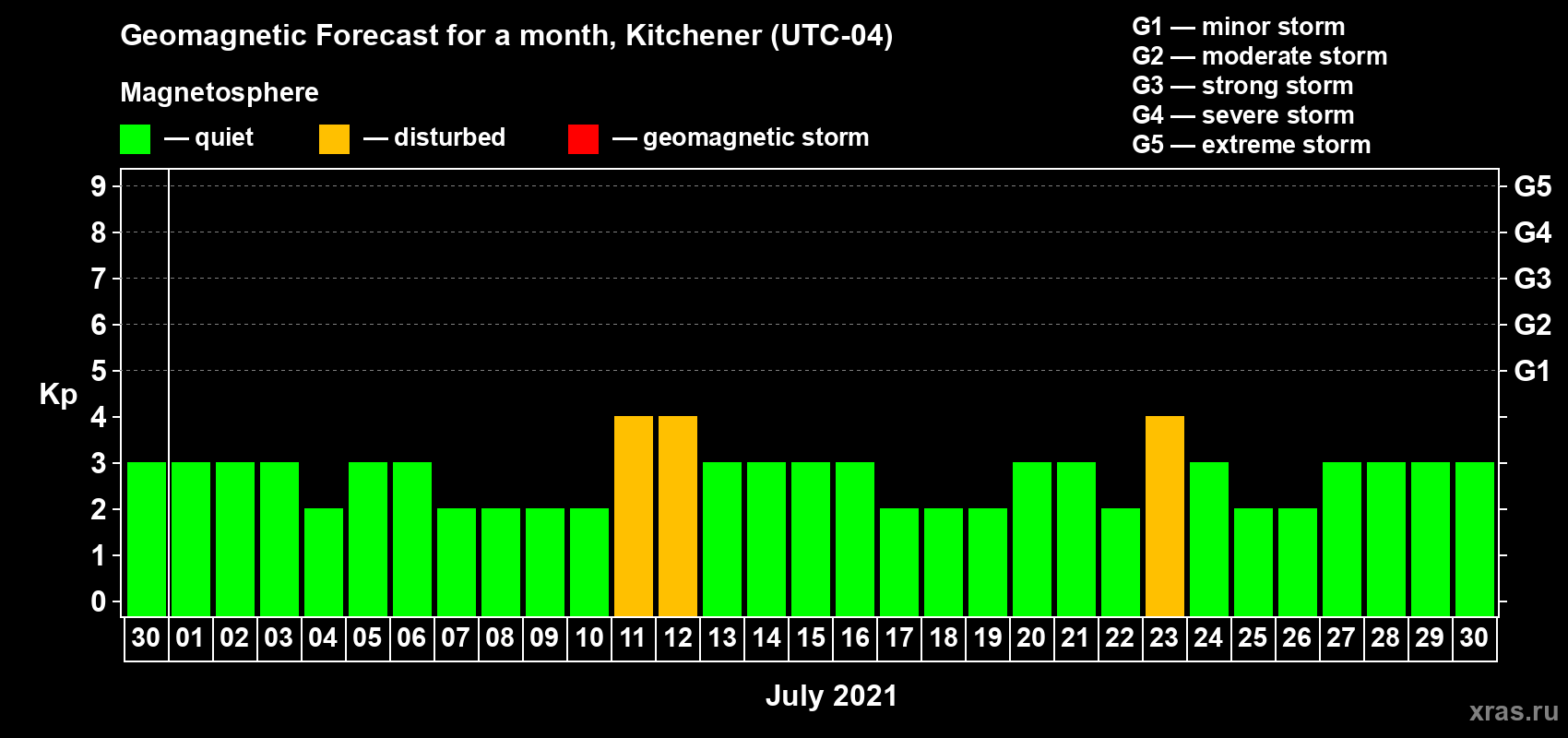 Geomagnetic storm forecast in Kitchener for Jun 30, 2021