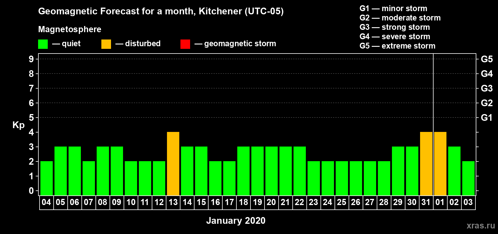 Geomagnetic storm forecast in Kitchener for Jan 04, 2020