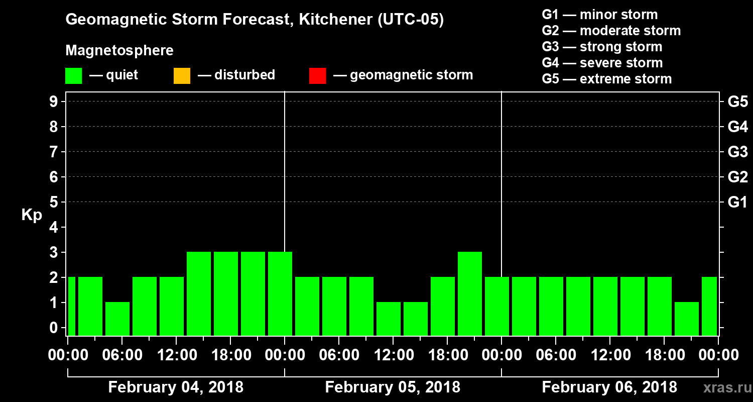 Geomagnetic storm forecast in Kitchener for Feb 04, 2018