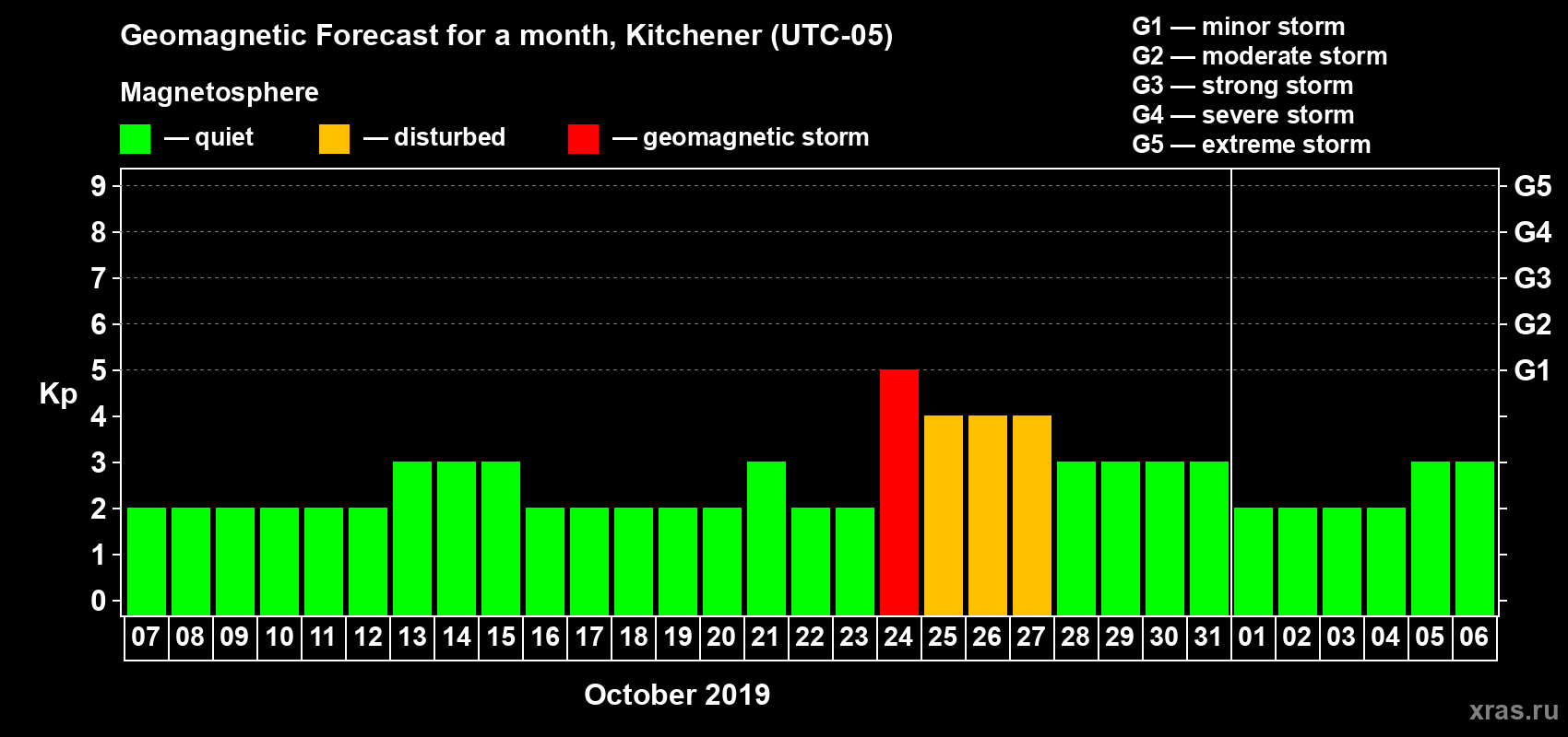 Geomagnetic storm forecast in Kitchener for Oct 07, 2019