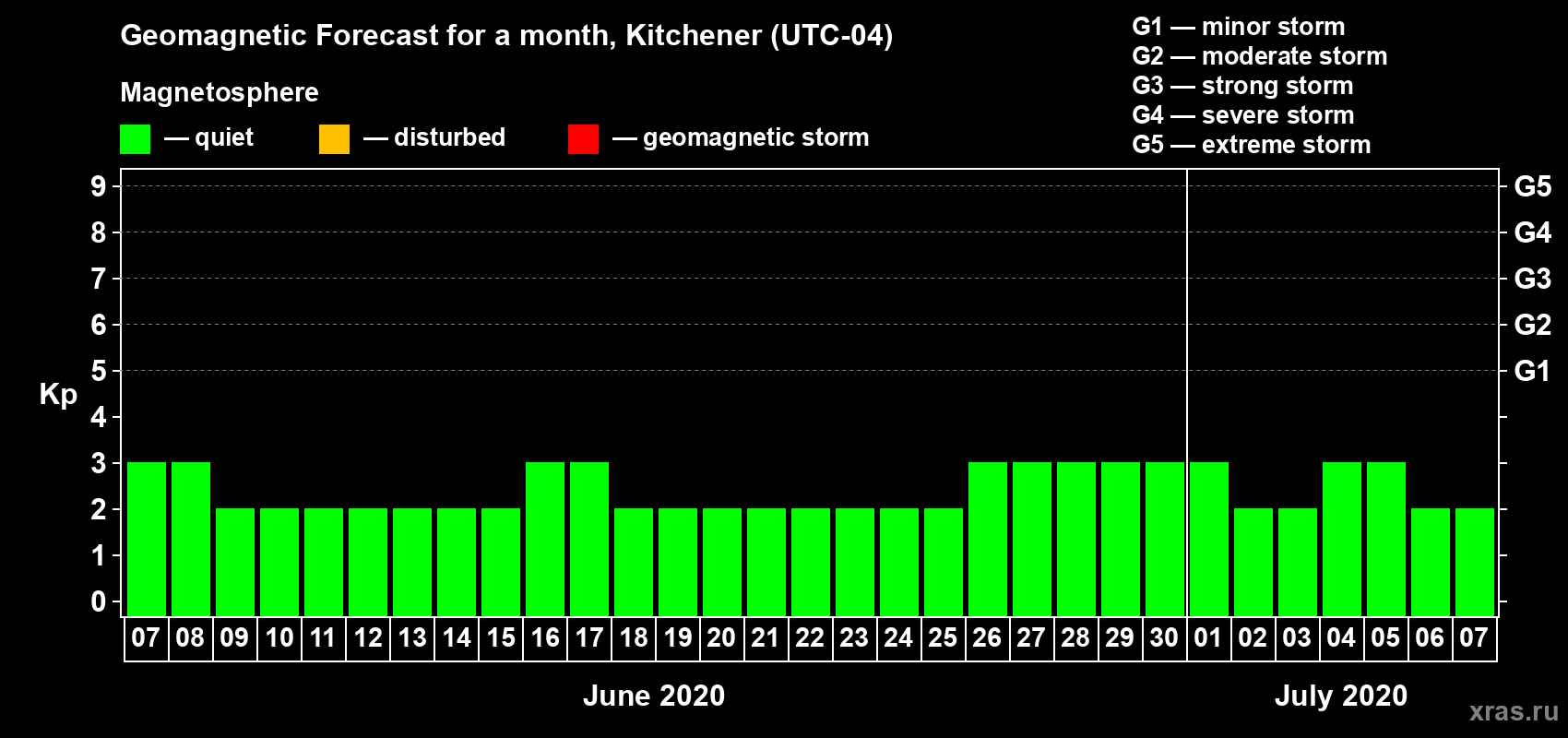 Geomagnetic storm forecast in Kitchener for Jun 07, 2020